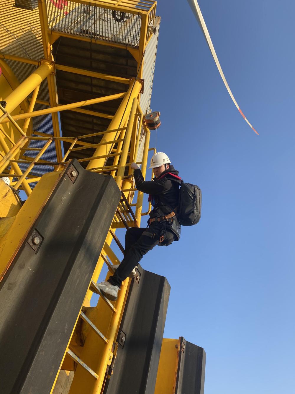 爬上数十米高的风机进行检修