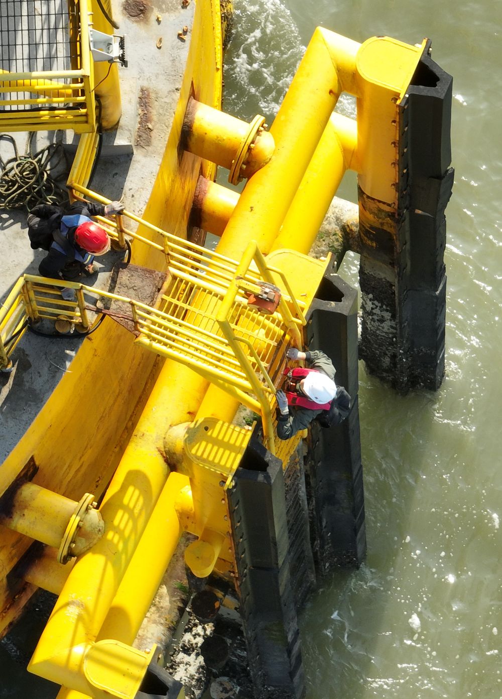 记者爬上海上风电平台基座。新华社记者 林善传 摄