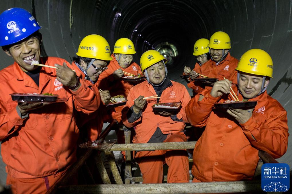 2014年1月30日农历除夕,为确保工程按计划顺利完工,中铁隧道集团承建的北京市南水北调配套工程东干渠第五标段仍在施工,工人们在自己的工作岗位上吃了顿特殊的年夜饭。新华社记者 张宇 摄