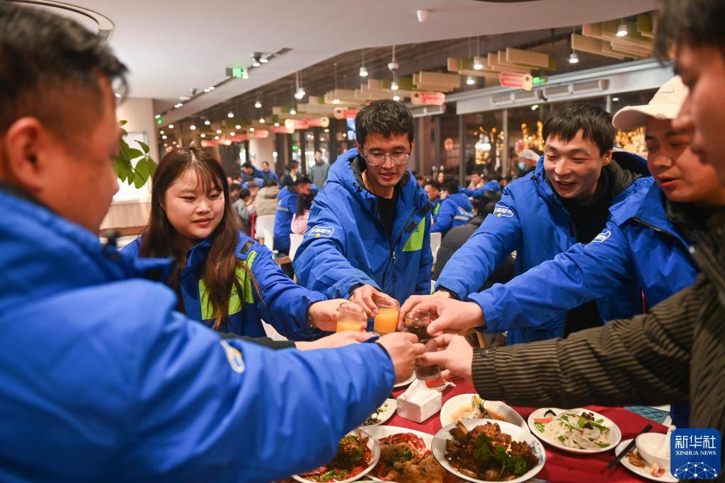 2025年1月22日,快递员和家属在“年夜饭”活动上碰杯。当日,200余名大部分来自外地的快递员及家属受邀参加一场“年夜饭”活动,提前在异乡感受春节团聚的温暖。 新华社记者 黄宗治 摄