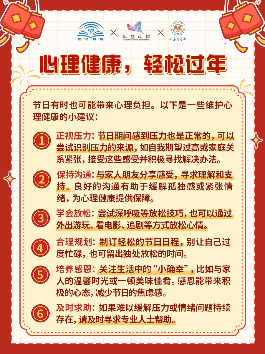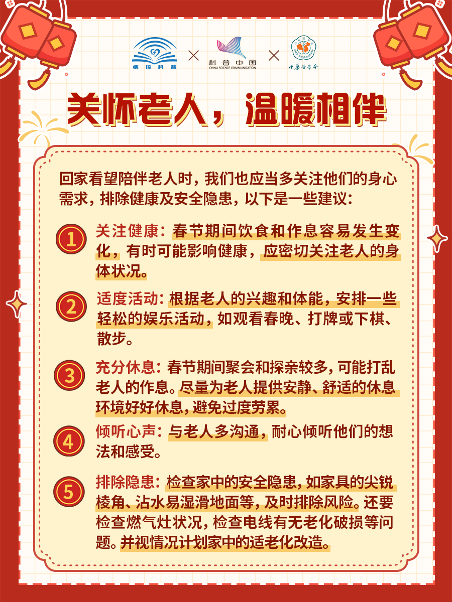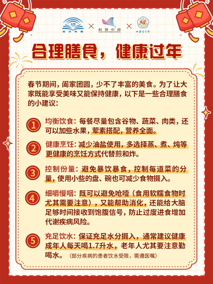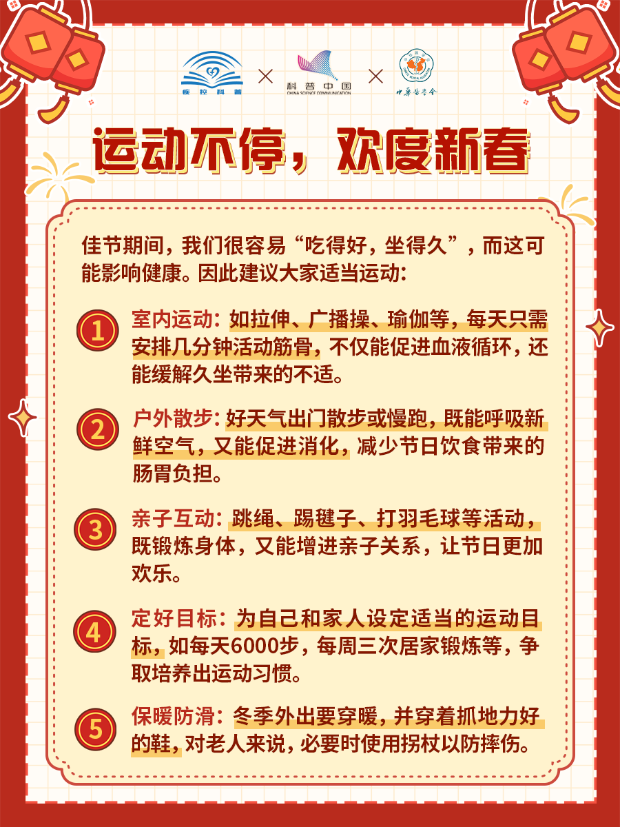 为了帮助大家度过一个愉快而健康的春节,我们整理了一些实用的小建议,涵盖饮食搭配、饮酒节制、适度运动、食品安全、流感预防、老幼关怀、交通出行等多个方面。