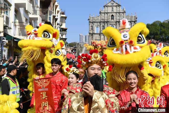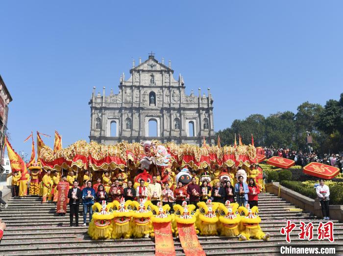 中新社澳门1月29日电 题:大三巴前春意“闹” 龙腾狮跃贺新年