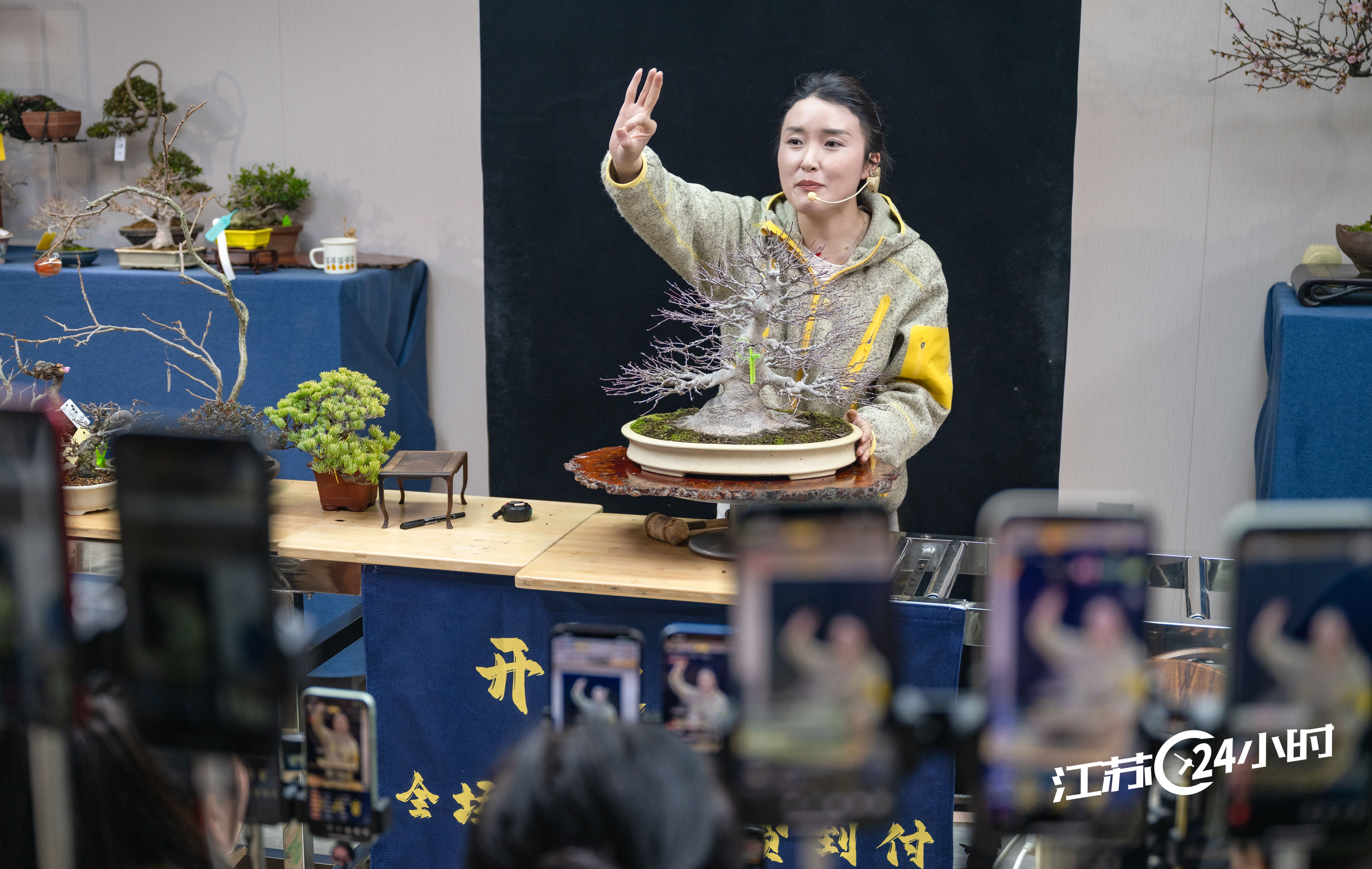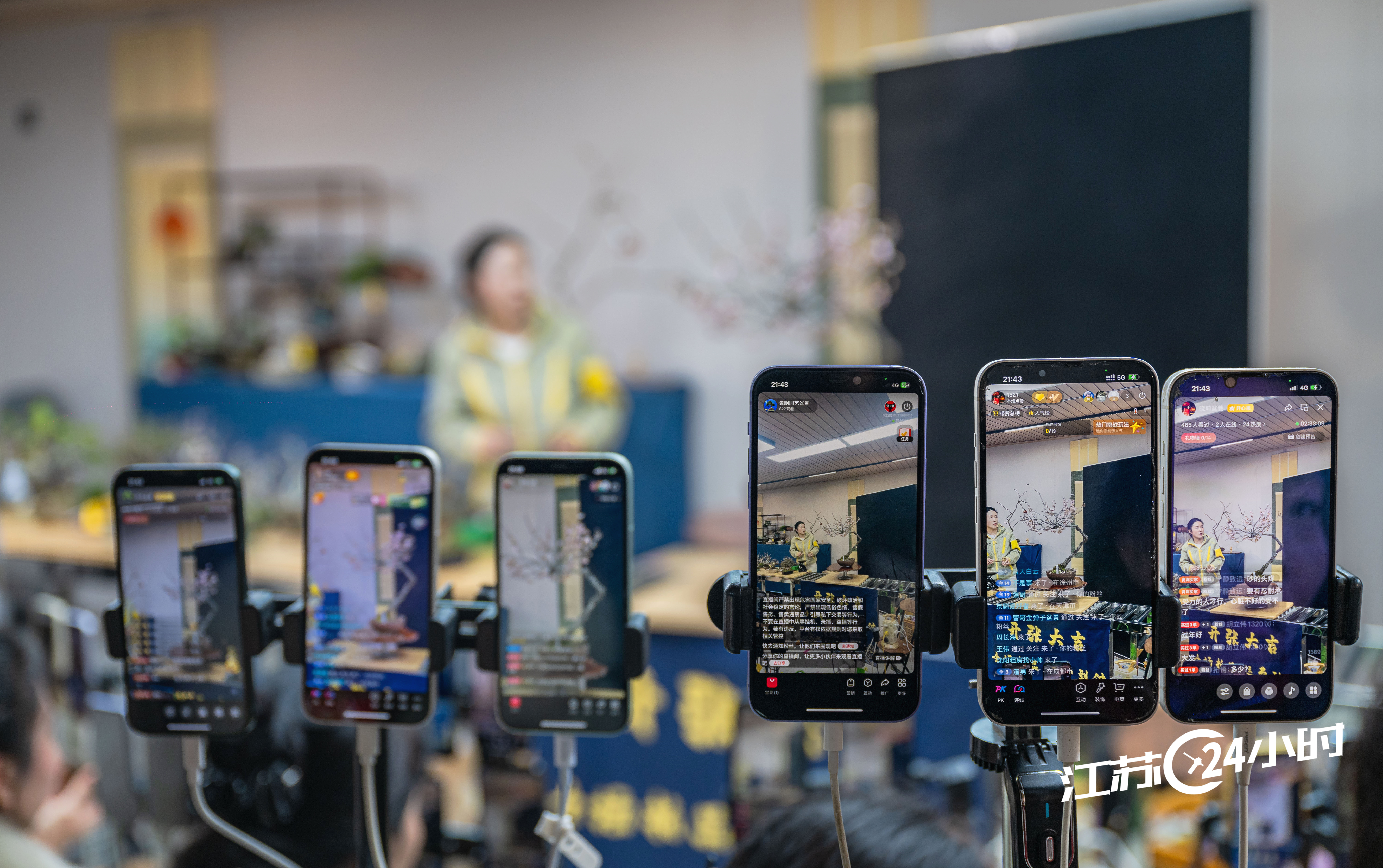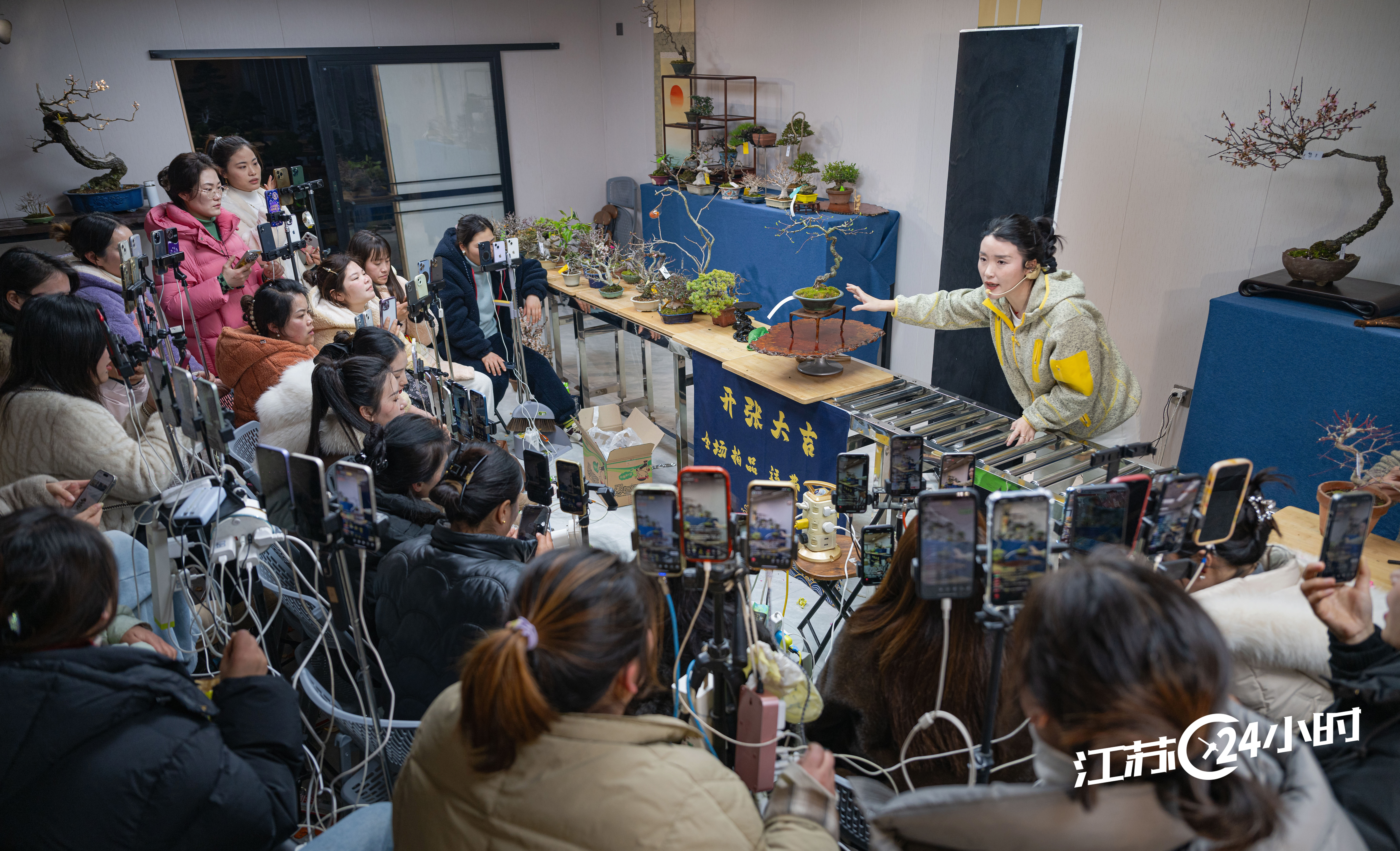 (特约摄影 周永 31日 21:48摄 8:51上线) 1月31日晚,沭阳县扎下镇艺川盆景拍卖中心,花木主播们通过矩阵直播销售盆景,竞拍气氛激烈,成交量不断,带动了花木盆景销售。
