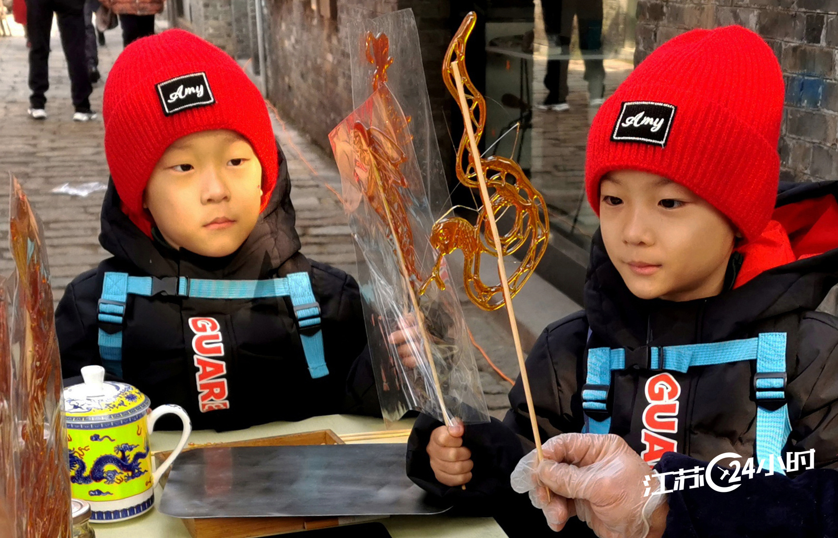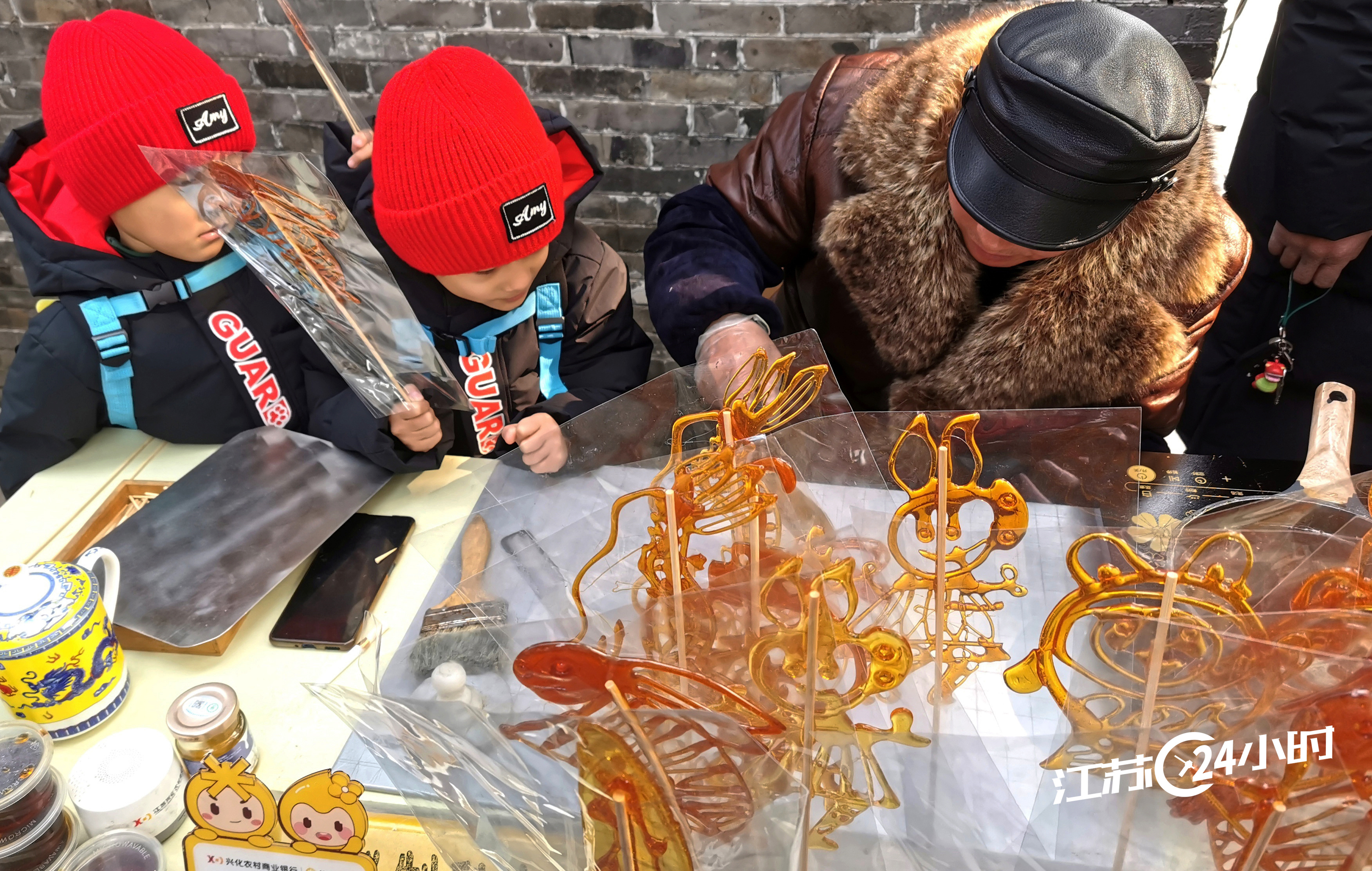 (特约摄影 杨桂宏 08:58摄 9:22上线)2月1日,兴化市八字桥老街,小朋友正在观赏糖画的制作,感受传统年味,喜庆农历乙巳蛇年。