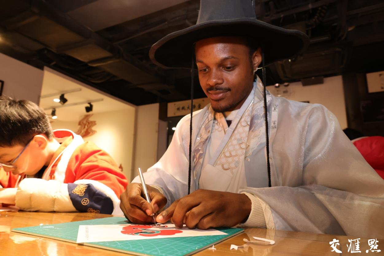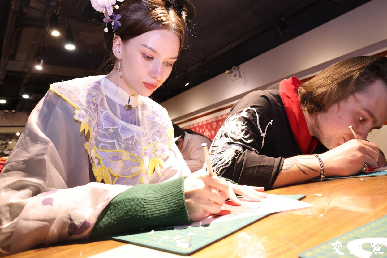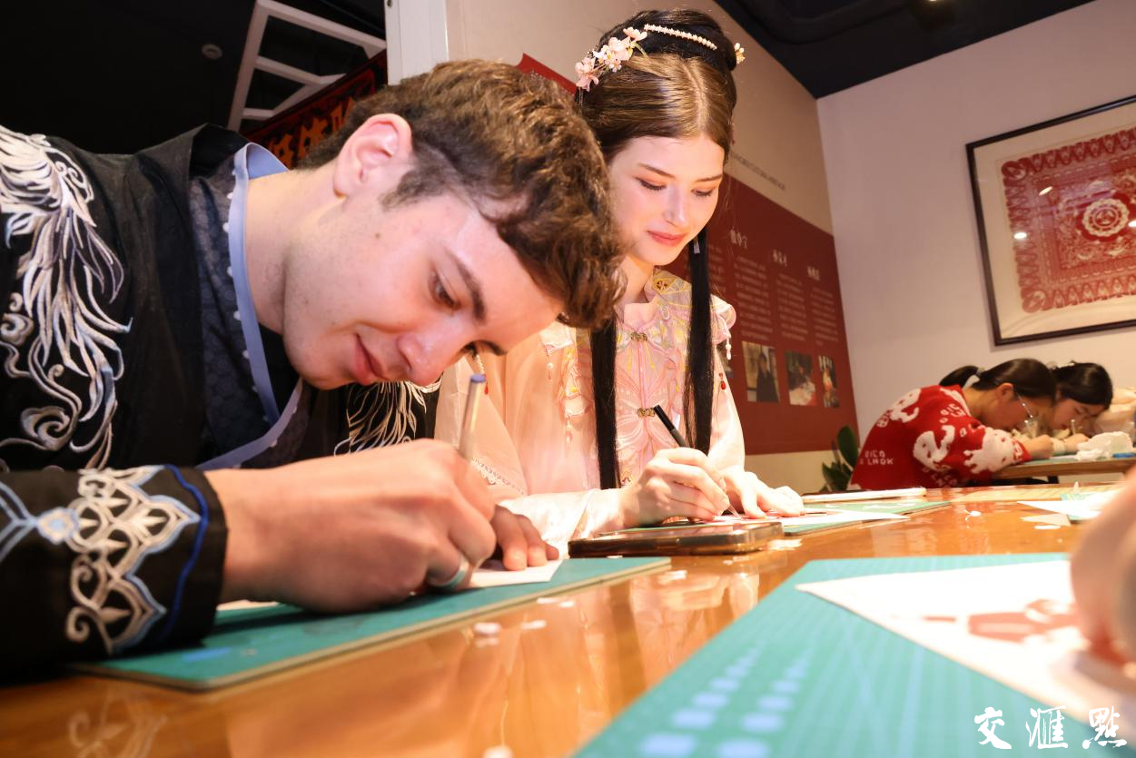 体验完拓年画,雨依旧下着,但这并没有浇灭他们继续前行体验的热情。刻纸,这门俗称“剪纸”的古老汉族民间艺术,也吸引着这群外国友人的目光。剪纸看似简单,实则不易,不仅要细心,还要有耐心。在这一群外国友人中,来自俄罗斯的Valeria,是最快完成生肖纸作品的,她还不忘鼓励身旁的男友Danil加油完成。她拿着自己的作品,告诉记者:“我在中国工作的这段时间,一直对中华传统文化特别感兴趣。剪纸的时候,我感觉在与中国文化深度对话。从这小小的纸张里,我看到了中国人对生活的热爱和对美的追求。”他们这群人耐心完成的剪纸凝聚着他们对中国文化满满的热爱。