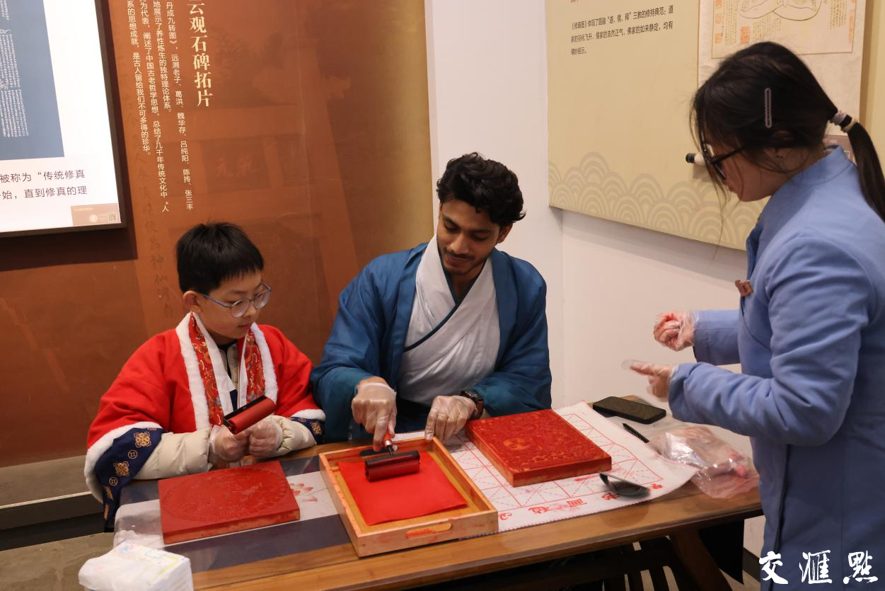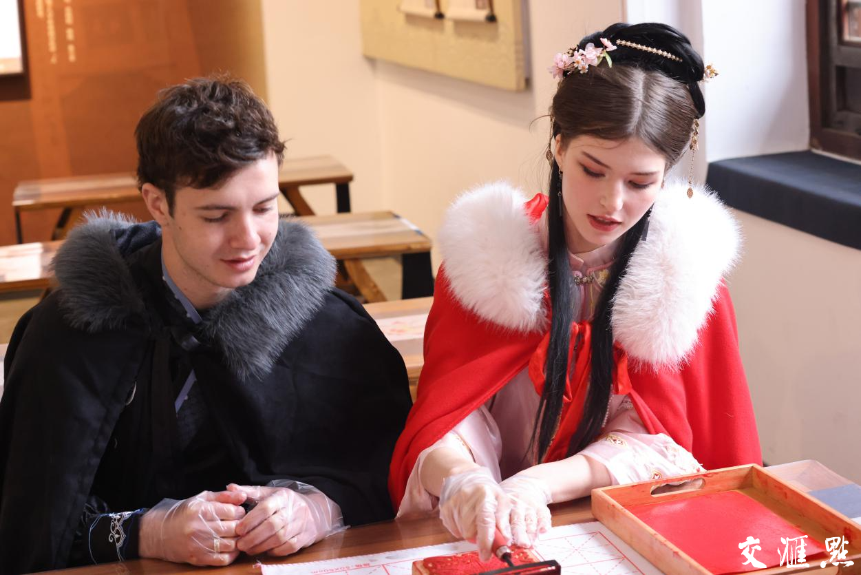 走进茅山东方盐湖城一间充满传统文化气息的年俗展馆,只见讲解员吴想正在教其他体验者拓年画。吴想边介绍边操作:“拓年画,先听步骤再操作。首先要滚轮蘸墨,少量多次、敷匀滚至碑面,再自上而下将宣纸轻敷于碑刻表面,接着可用打刷或拍板等方法,使图案轮廓更加清晰,最后纸张由上而下慢慢掀起,年画就做成啦。”来自白俄罗斯的Lisa目不转睛地盯着,看完后轮到他们体验了,当一幅年画作品《春》跃然纸上时,她会心一笑,和身旁的Sergei直呼“amazing”。他们告诉记者,他们从未见过这样的艺术形式,这让他们感受到了中国文化的独特魅力。