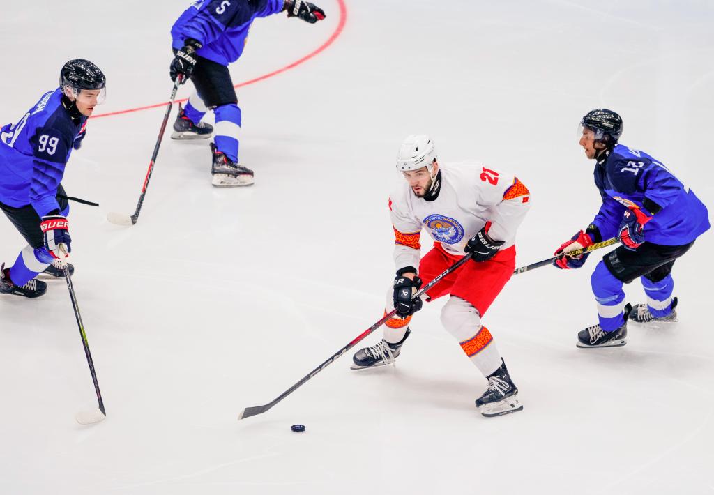 2月3日,吉尔吉斯斯坦冰球队球员赛福洛夫(右二)在比赛中。新华社记者 王建威 摄