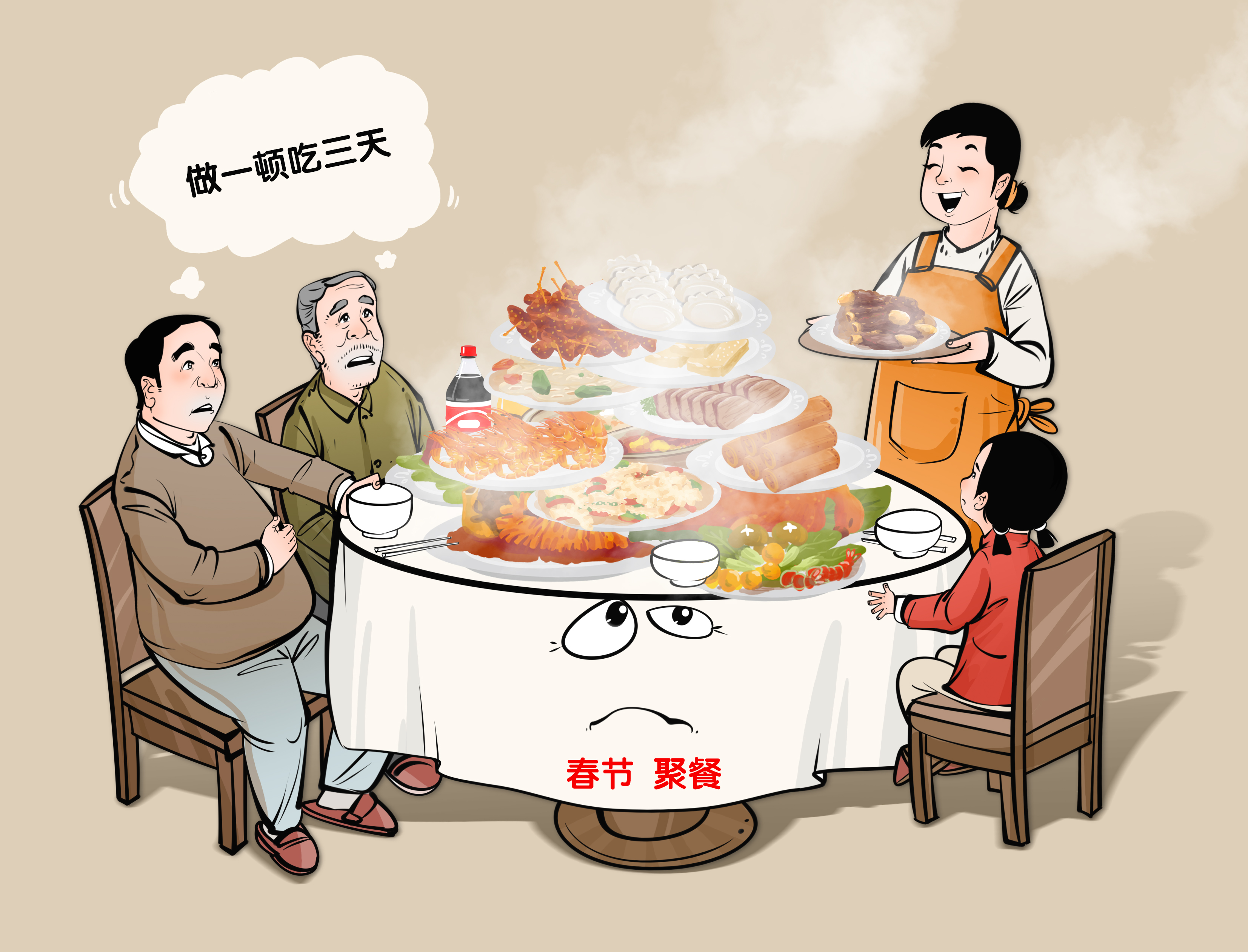 春节聚餐是必不可少的温馨时刻,然而聚餐过后的剩饭剩菜也是普遍现象。据报道,春节期间,每户家庭平均能产生近2公斤的剩菜剩饭,“做一顿吃三天”成了不少家庭的常态。