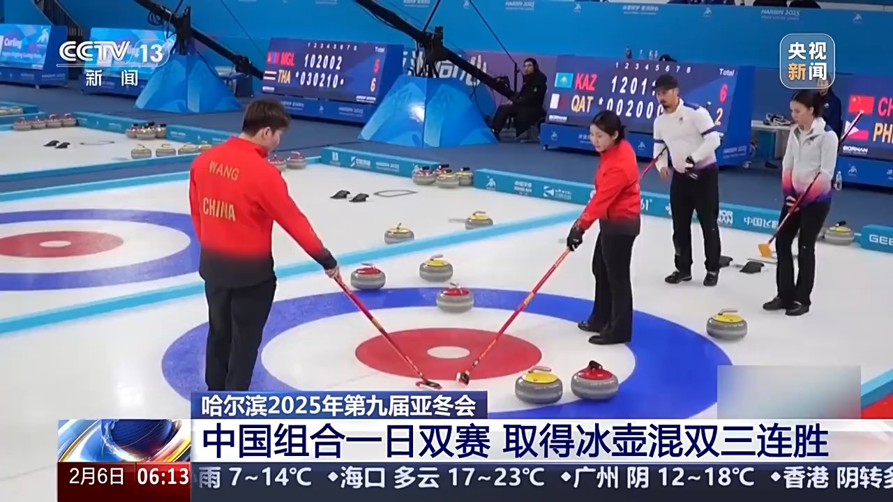 亚冬会冰壶混双项目循环赛昨天进入第二个比赛日,中国队组合韩雨/王智宇一日双赛。在上午战胜吉尔吉斯斯坦队后,晚上他们又以9比6击败菲律宾队,赢得开赛后三连胜。