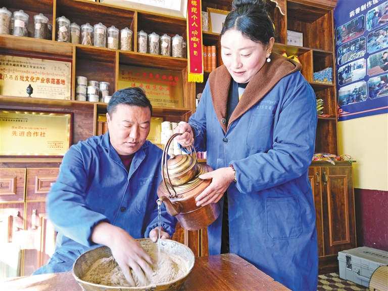 说话间,洛桑轻轻拿起一旁摆放着的藏药材,向记者展示:“你看,我的家乡地处海拔4500米以上,大自然可真是慷慨,馈赠了这么多好东西,像这杜鹃叶、甘松、丁香、肉豆蔻等等,都是做藏香的好原料。”他捻起一小撮甘松,放在鼻尖嗅了嗅,“这些藏药材对人体益处可多了,也是咱藏香品质过硬的底气所在。”