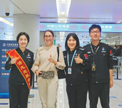 外国游客在杭州萧山国际机场国际服务中心,为便捷的入境服务“点赞”。李玎摄