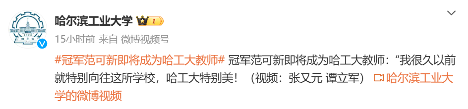 赛后,范可新透露自己即将入职哈尔滨工业大学,成为一名哈工大教师。