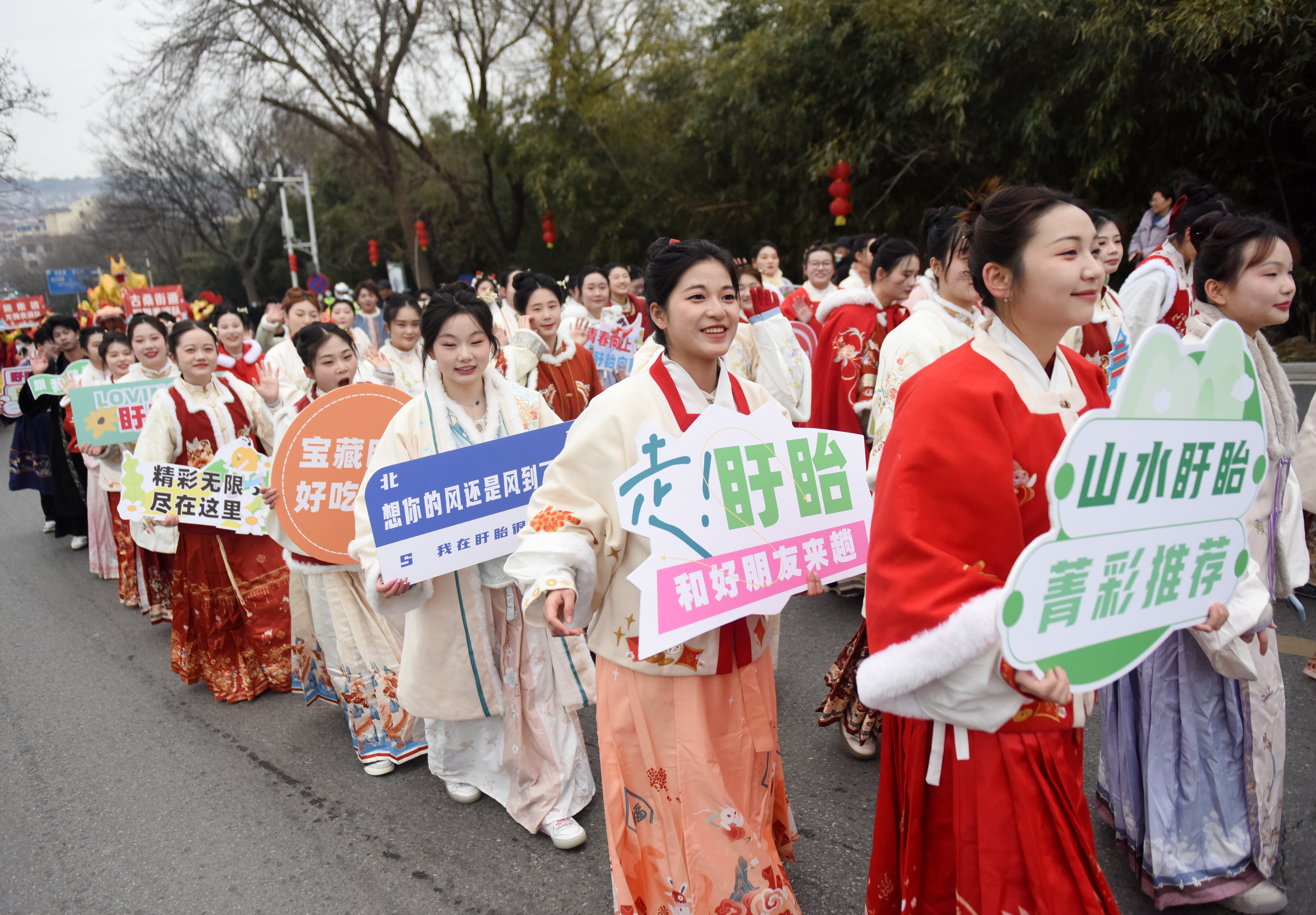 鱼灯闪烁、花船摇曳、舞龙舞狮精彩纷呈,游客和市民们看得目不暇接。在浩浩荡荡的队伍中,来自全国40余所高校的60余名盱眙籍大学生组成“菁彩盱眙推荐官”方阵,他们身着汉服,或束发盘髻、罗衣飘飘,或素色布衫、长风玉立,或锦衣华裳、飘逸灵动,或大气华贵、端庄秀丽热情地与观众互动招手,成为巡游队伍中一道最靓丽的风景。“作为一名大学生,能参加民俗巡游活动,太开心了!”来自南京师范大学的张毓桓表示,“以后我也会向更多的同学安利盱眙、推荐盱眙”。