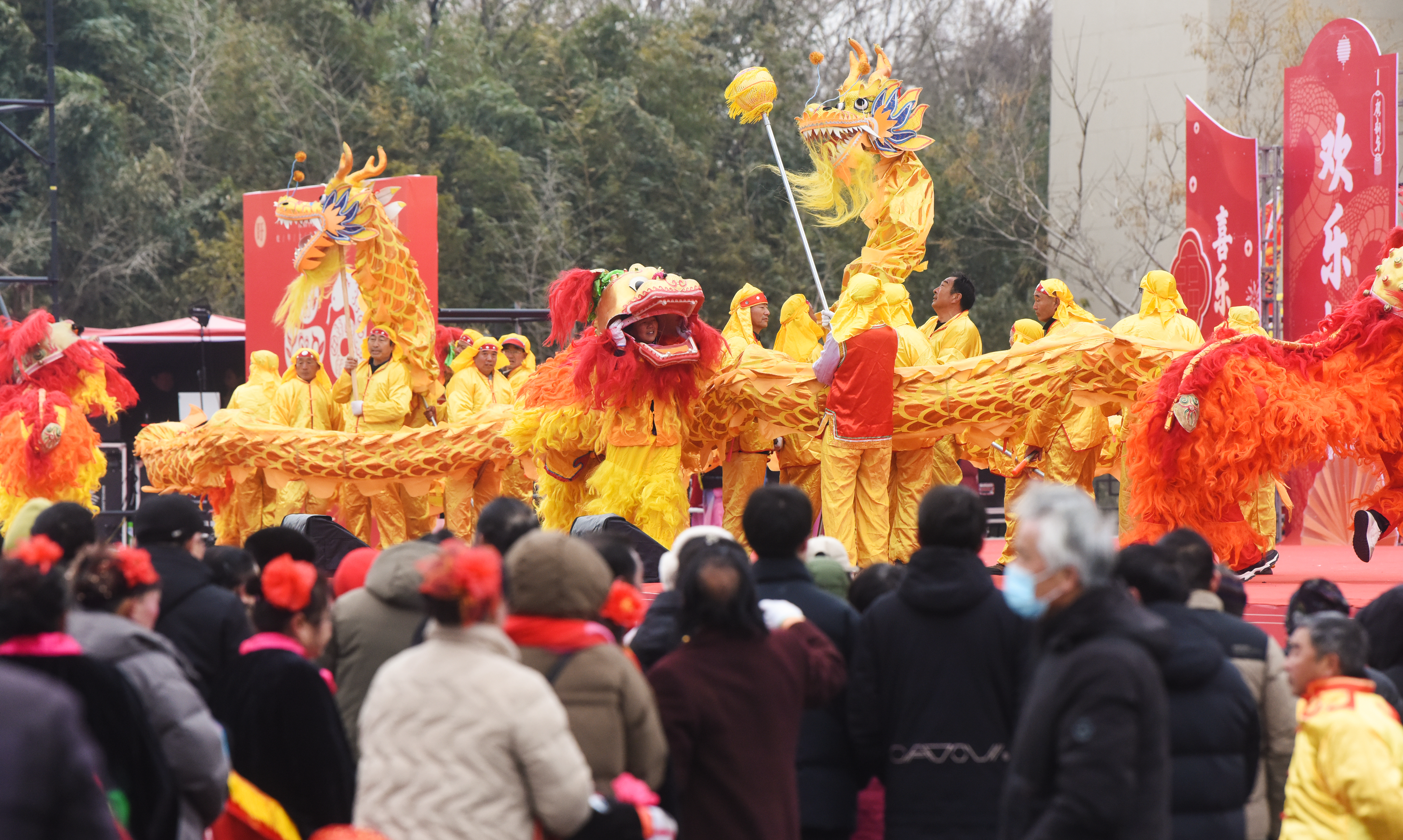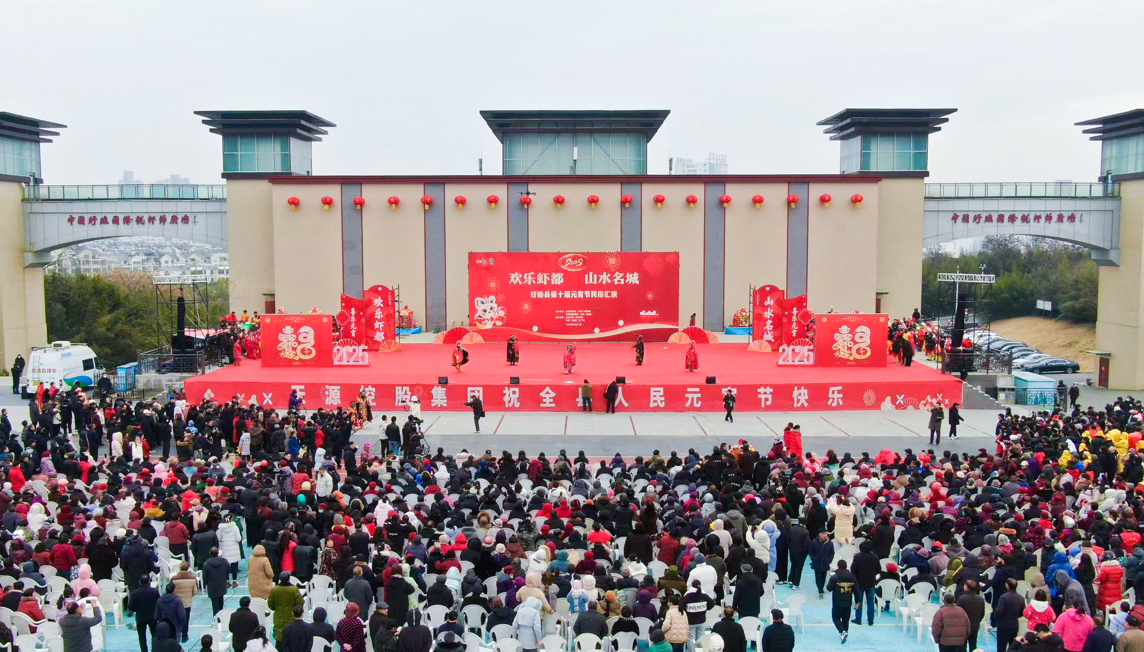 在完成全程2.8公里的巡游后,巡游队伍到达了盱眙龙虾节广场绕圈一周。此时广场上已是人山人海,来自各镇街的十三支民俗演出队伍,在此为市民和游客带来了一场盛大的民俗演出。