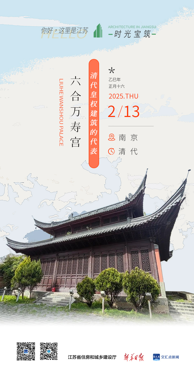 六合万寿宫坐落于南京市六合区长江路上,为重檐歇山砖木结构古建筑,坐北朝南。六合知县元茂琦用真观二郎庙旧址改造,并亲自撰写“新建万寿宫记”碑文并书之,由赑屃驮碑,现遗留赑屃伏于万寿宫门东侧。万寿宫于咸丰八年(1858年)毁于战火,光绪九年(1883年),为庆贺慈禧太后50岁寿辰,当地官员重修万寿宫大殿,终成今日规模。