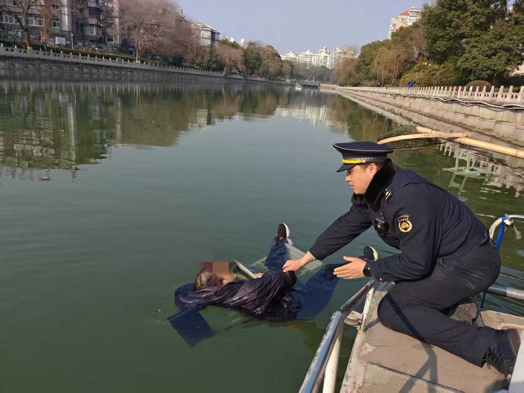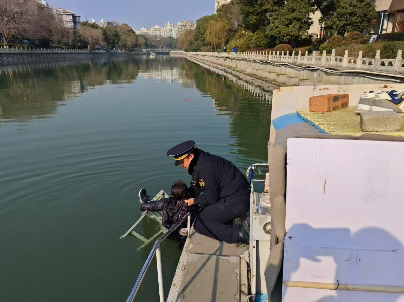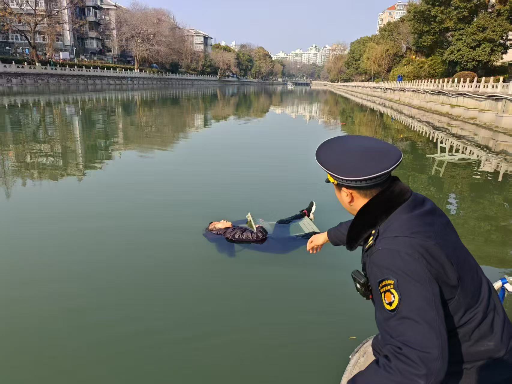交汇点讯 13日下午2点多,南京武定门外的秦淮河畔上演了一场暖心救援。当时,正在轮休的建邺区城市管理综合行政执法大队直属机动中队执法人员朱伟看到不远处围了一群市民,并听到市民呼救:“河里有人落水了!”他立刻与同事陈力列赶往现场。