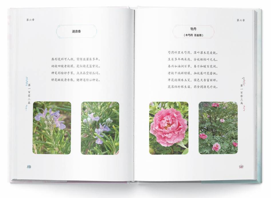 经过反复筛选、精心编辑,《诗语花意》收录200篇。以朵朵赤焰、嫣红似火、平安吉祥的安石榴花开篇,到纤纤花丝、绚丽繁茂、似蝶展翅的醉蝶花收尾,每篇内容延续微博图文并茂的风格,诗图贯通,前后呼应,浑然一体。从封面封底到图书内页,作者对每个插图和版面都进行精心设计,意在体现一种美的追求、妙的意境。在每个篇章子目录部分,对用于排序的拼音字母及连接线进行了艺术化设计,从拍摄照片中选取每一个花的聚焦圆图,呈现每个篇章花的群像。书中选取了拍摄的十二张景观照作为补白,选取了作者创作的五十幅花卉国风水彩放在相应的诗歌标题一侧。在正文页面,以苏梅粉、昌荣紫、吉量绿、晴蓝、赤金这五种中国传统颜色为灵感,设计了标题框和修饰图,以梅花、牡丹、玉兰、玫瑰、山茶的水彩作为页码修饰,并依据五彩主题选取了十类花的水彩作为篇目边框修饰。所有这些,都象征着生活福暖四季、福满乾坤,象征着人生幸福快乐、美好祥和。