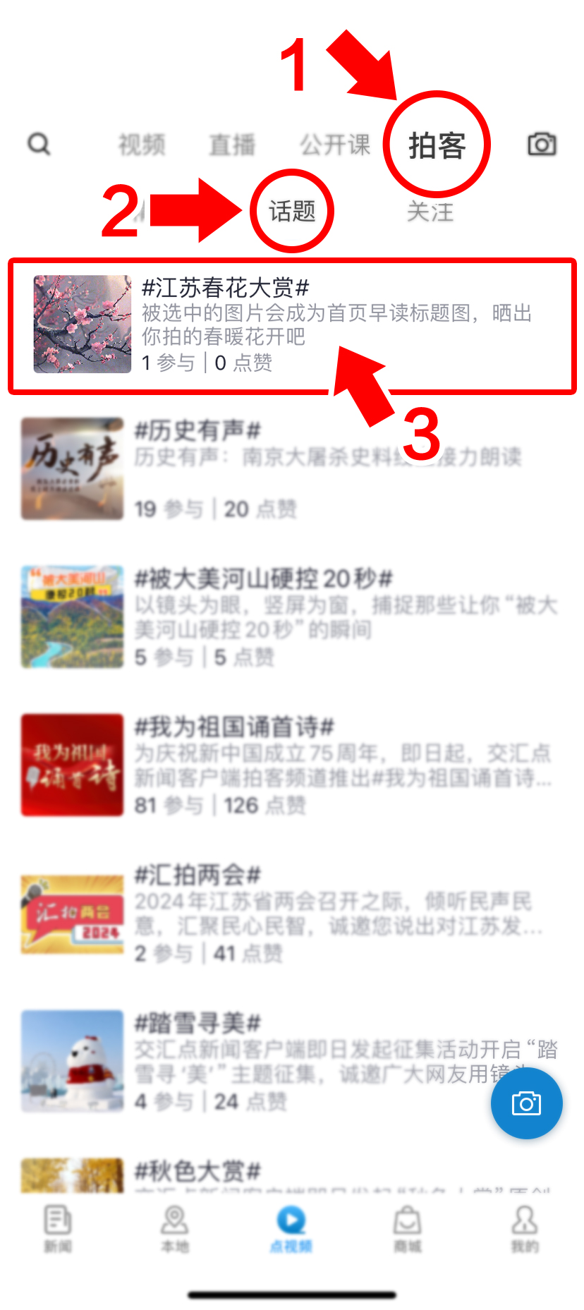 操作提示(见下图):点击交汇点新闻客户端底部菜单栏—点视频—拍客—话题,即可根据要求投稿。