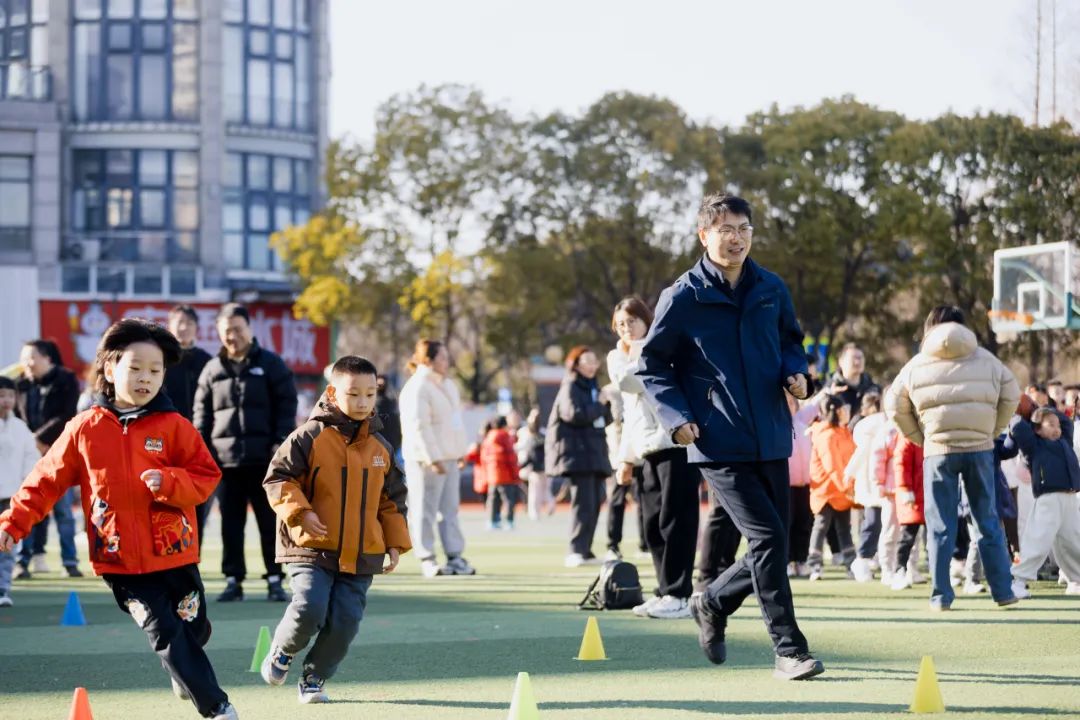 操场上,伴随着欢快而富有节奏的音乐,家长与孩子共同奔跑、跳跃,享受着运动带来的快乐和亲子之间珍贵的相伴时光。学校提供所需器材,安排体育老师提供科学的运动指导,确保运动的安全、高效、有益。8点20分,第一节体育课准时开场,整个年级的学生整齐有序地走进操场。参与晨练的家长们并未离开,而是化身成为孩子们的“教练”。在课程的核心环节,学校体育组带领全体学生进行热身与放松活动,精心设计丰富多样的课程内容资源,供灵活选择,确保每一堂课都能精彩纷呈、满足学生需求。