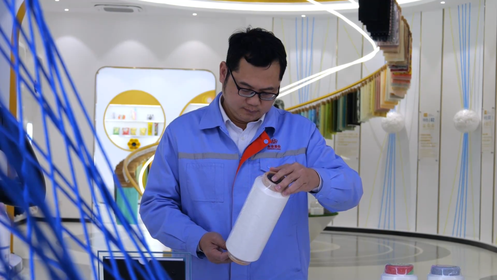“爱赛纶”,即消费后再生锦纶纤维产品,是永荣锦江自主创新的环保再生绿色产品。公司研发总监黎明介绍,“通过我们自主的超临界的技术路线,整个过程是不需要添加任何的化学药剂,从而实现了废弃的尼龙服装面料回收,制成环保的再生的纤维。”