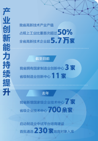 高水平创新载体是产业发展和资源汇聚的“蓄水池”。目前,我省已有3家国家制造业创新中心、11家省级创新中心,通过组织有序的协同研发,这些载体攻克了集成电路先进封装、高性能有机纤维、气血交换膜材料等一批关键技术产品,打破国外垄断。去年,我省还新增国家级企业技术中心7家,省级700余家;印发制造业中试平台建设实施方案,首批遴选230家中试平台培育对象入库。