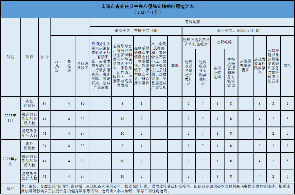 据南通市纪委监委通报:2025年1月,全市共查处违反中央八项规定精神问题34起,批评教育和处理41人,其中给予党纪政务处分41人。从问题类型看,查处形式主义、官僚主义问题9起、批评教育和处理12人,查处享乐主义、奢靡之风问题25起、批评教育和处理29人。从人员级别看,批评教育和处理县处级干部4人、乡科级及以下人员37人。