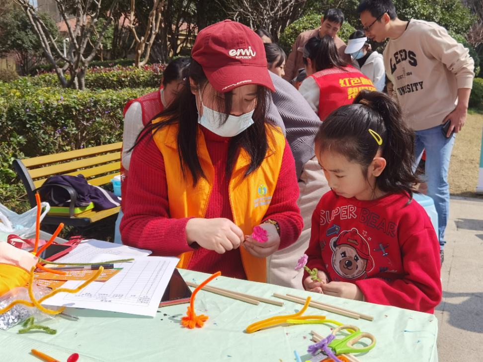 此外,在手工文艺区内,亲子扭扭花、手工布包和手串制作项目颇受孩子们的欢迎。孩子们在家长的陪伴下,眼神中充满了好奇,小手认真地摆弄着材料,普通的手工材料在一双双巧手的创作下变成了一件件精美的手工作品,亲子间的互动温馨而美好。现场还特别设置了“哪吒”和“敖丙”两个卡通人形立牌,成为孩子们争相拍照打卡的热点。“五老志愿者”房战英阿姨也带着小孙女来到现场参加活动,她表示:“今天的活动非常有意义,不仅给小朋友们带来了欢乐,也为我们老人们提供了便利。”