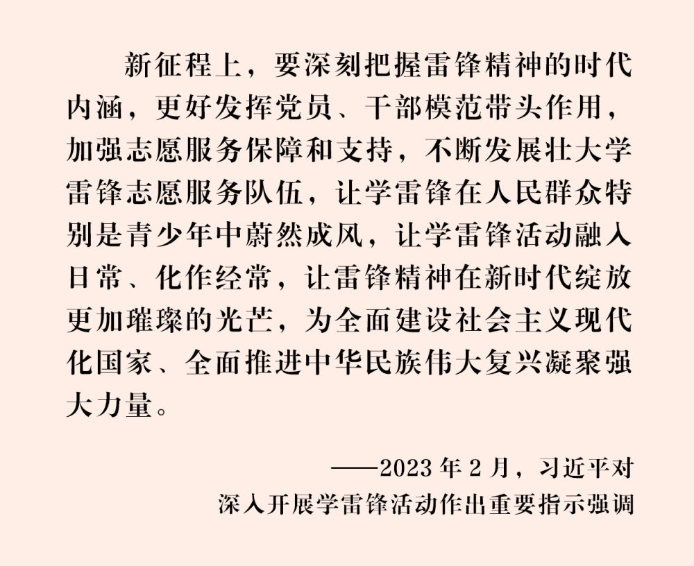 “实践证明,无论时代如何变迁,雷锋精神永不过时。”党的十八大以来,习近平总书记在多个场合发表讲话、作出指示,深刻阐明雷锋精神的永恒价值,明确要求发展壮大学雷锋志愿服务队伍,为新时代更好弘扬雷锋精神提供了根本遵循。