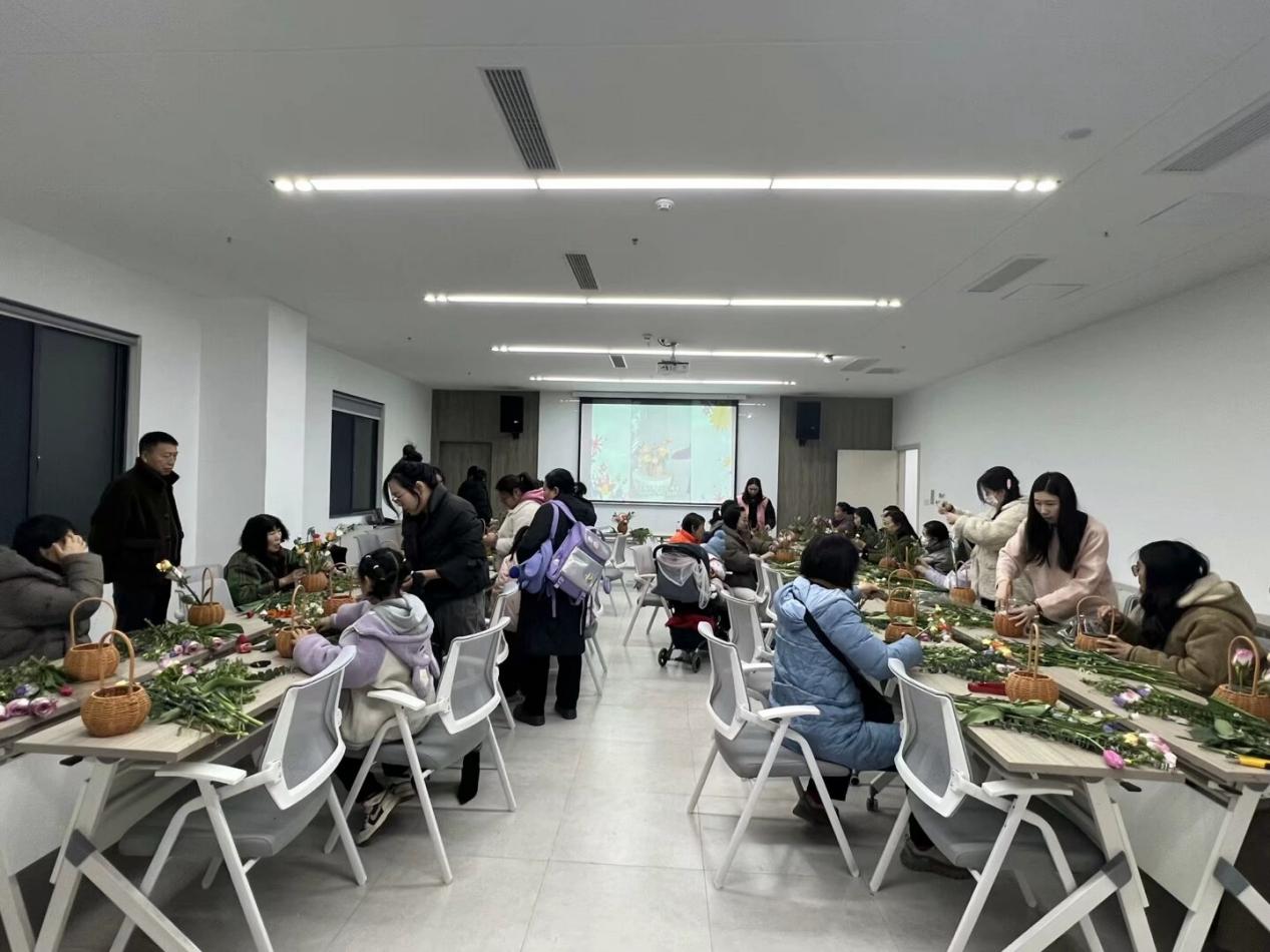 当天,社区工作人员提前布置好了场地,将准备的康乃馨、玫瑰、满天星、桔梗、郁金香、尤加利叶等多种鲜花整齐摆放,还配备了花泥、花篮和修剪工具。现场花香四溢,充满了春天的气息和节日的氛围。