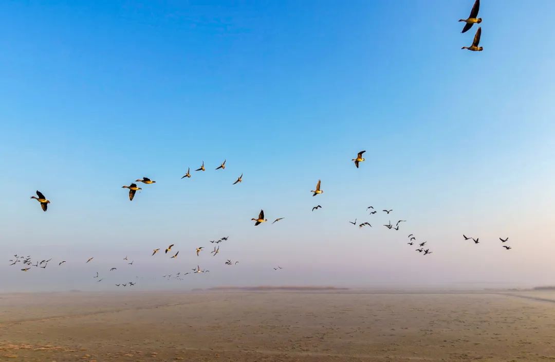 成群结队的大雁在石臼湖飞翔