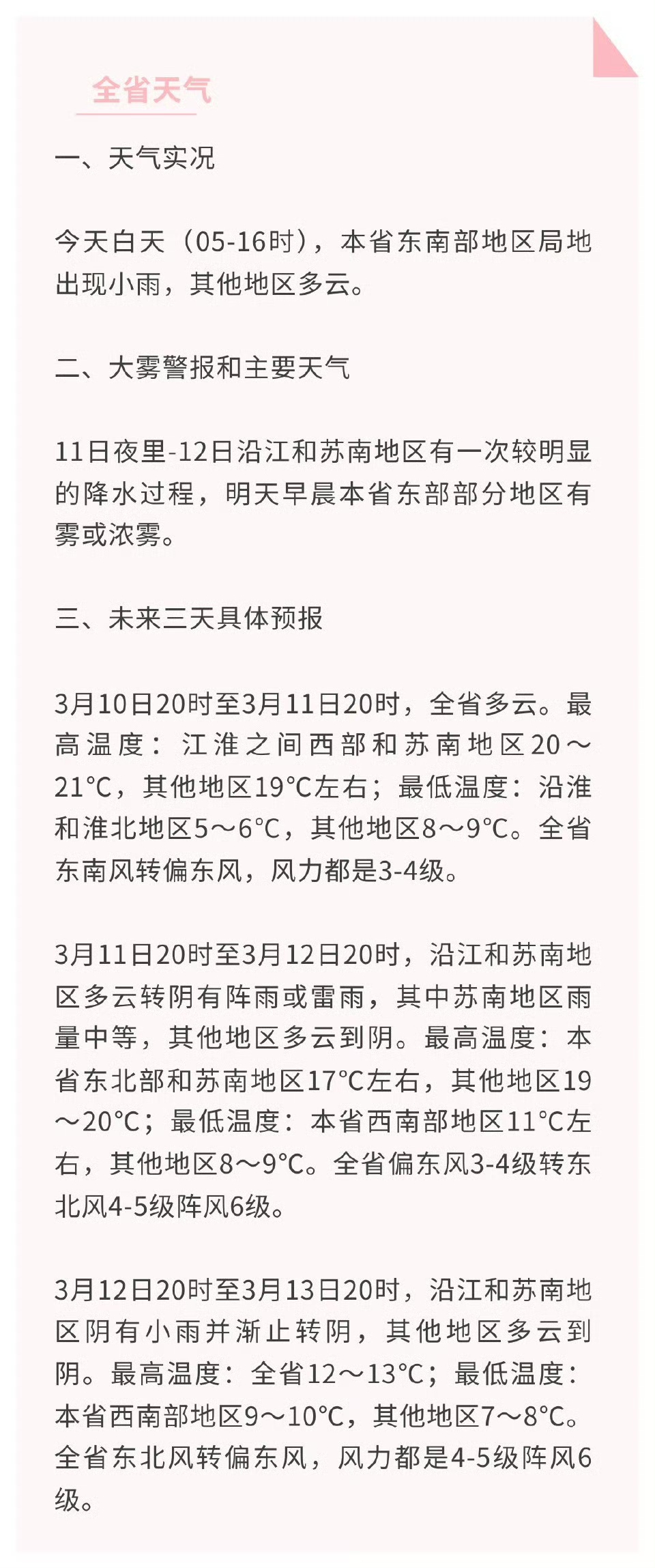 3月10日20时至3月11日20时,全省多云。最高温度:江淮之间西部和苏南地区20~21℃,其他地区19℃左右;最低温度:沿淮和淮北地区5~6℃,其他地区8~9℃。全省东南风转偏东风,风力3~4级。