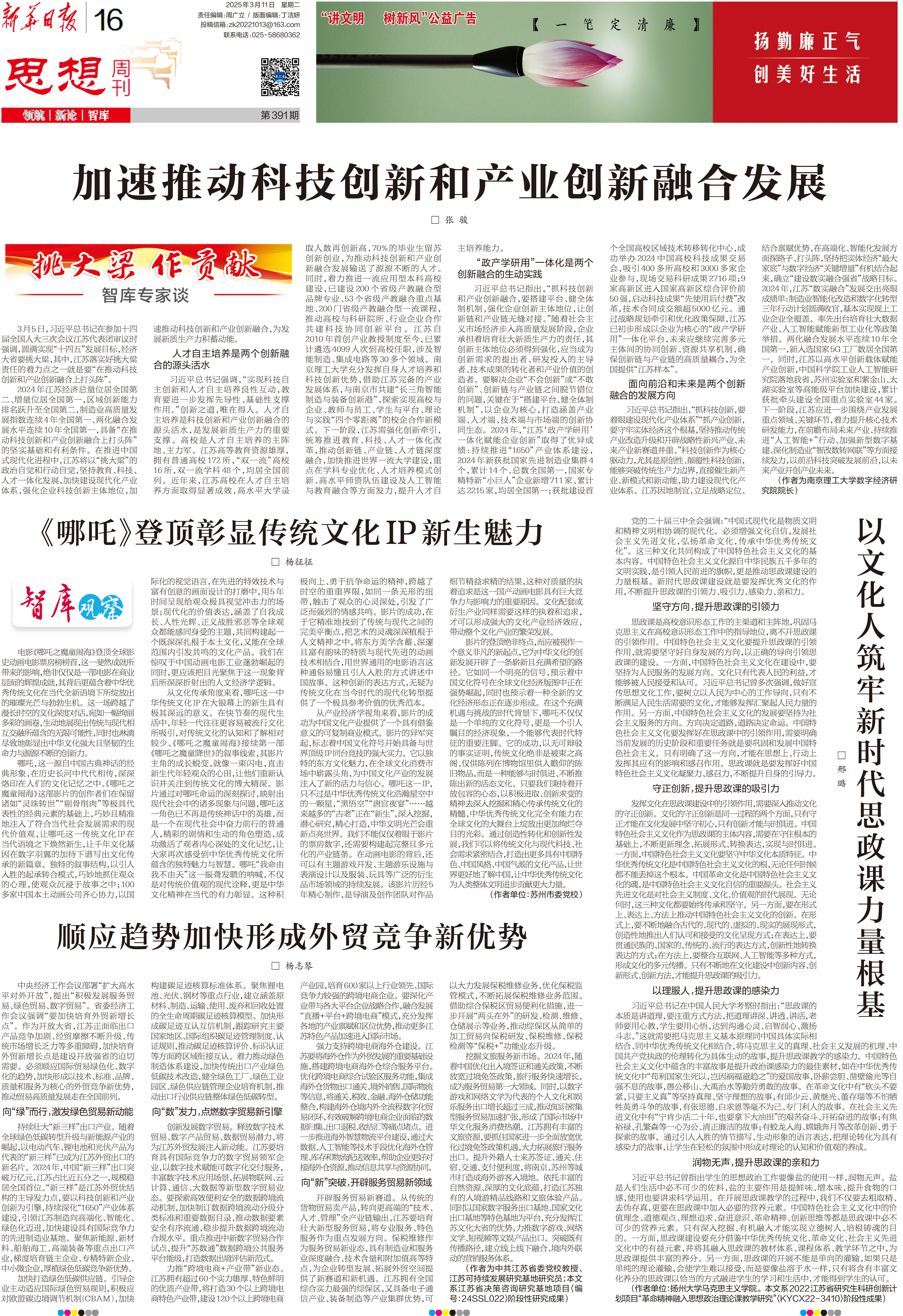 江苏经济总量全国第二、增量全国第一,区域创新能力排名跃升至全国第二、制造业高质量发展指数连续4年全国第一、两化融合发展水平连续10年全国第一,具备“在推动科技创新和产业创新融合上打头阵”的坚实基础和有利条件。在推进中国式现代化进程中,江苏将以“挑大梁”的政治自觉和行动自觉,坚持教育科技人才一体化发展、加快建设现代化产业体系、强化企业科技创新主体地位,加速推动科技创新和产业创新融合,为发展新质生产力积蓄动能。(详情>>)
