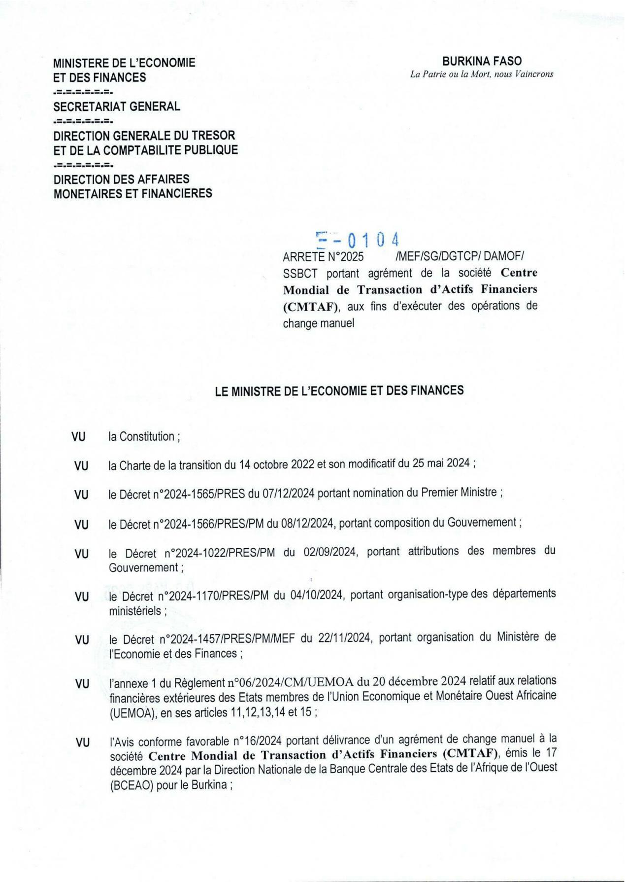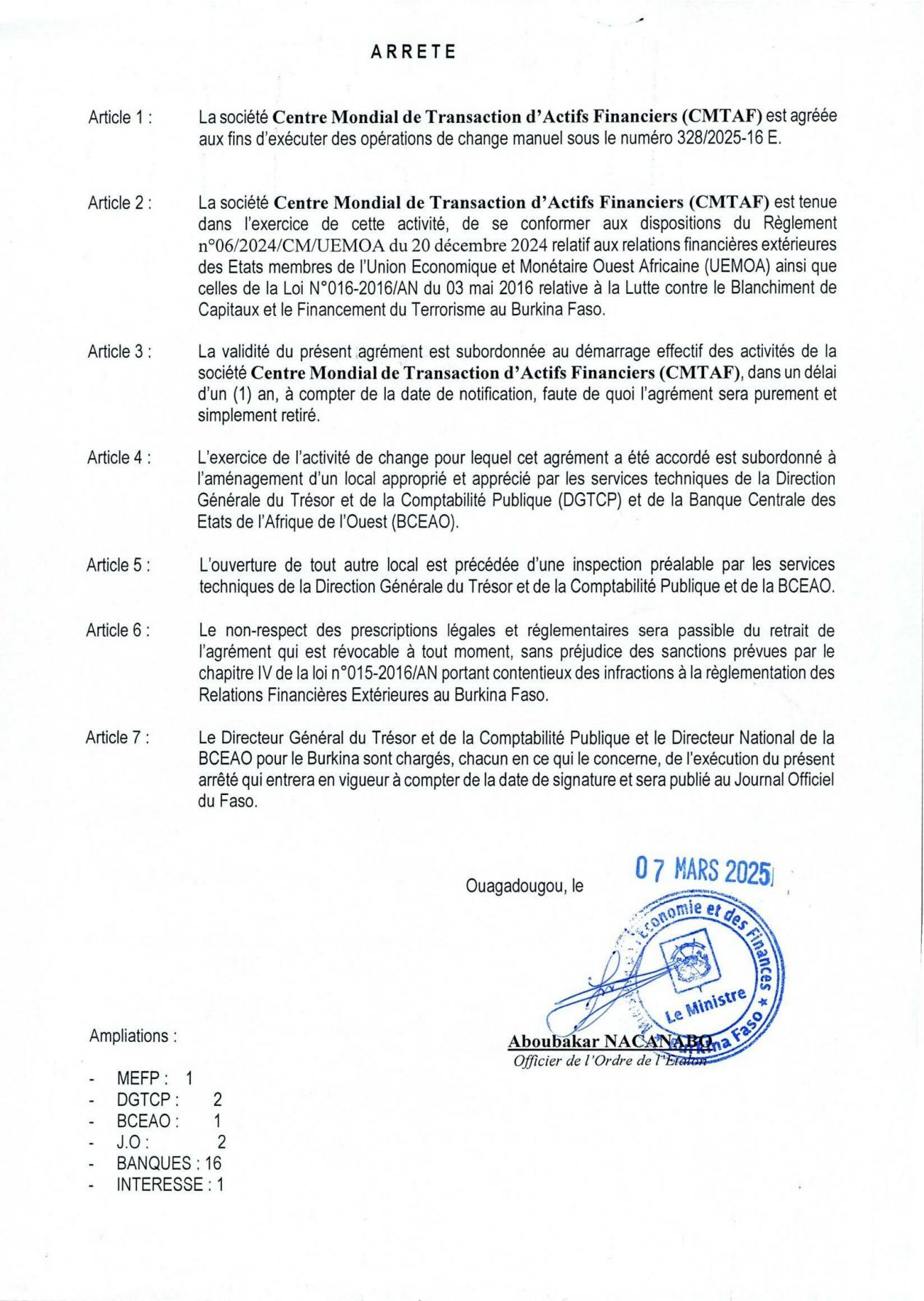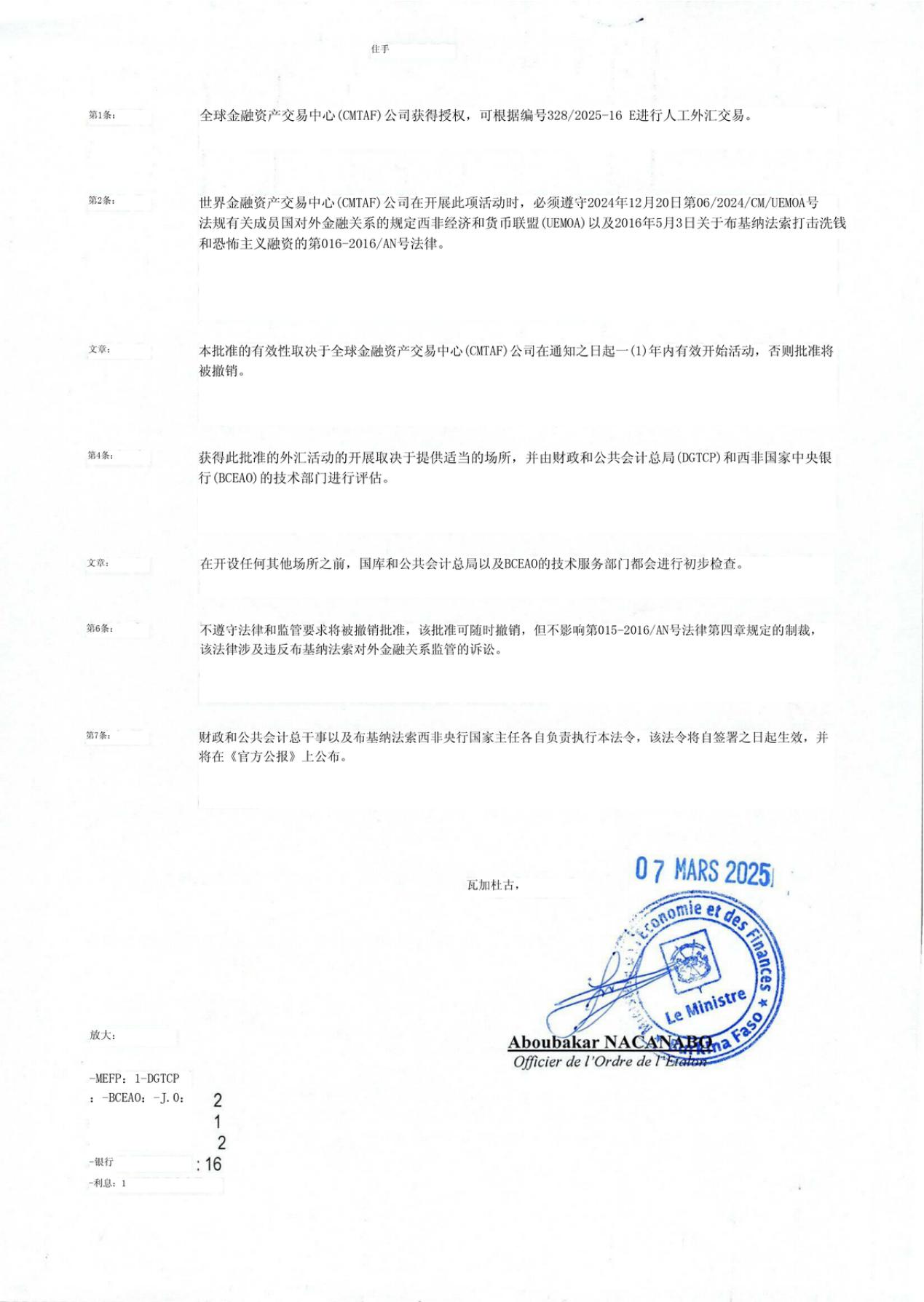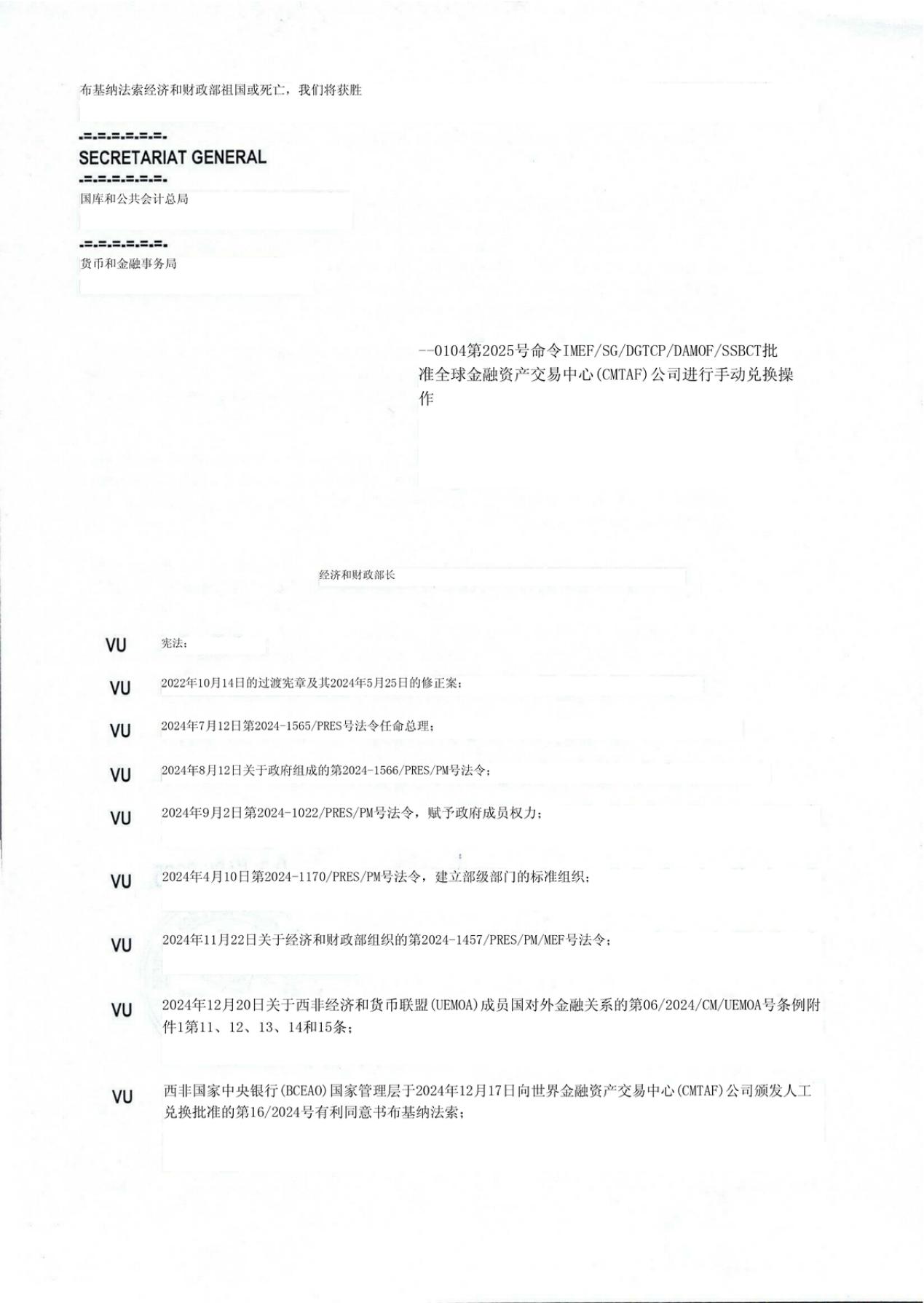 截至2024年12月,经布基纳法索国家经济和财政部、国家安全部及其下设各机构的审核,世界金融资产交易中心(CMTAF)顺利将关于个人换汇许可法令的材料递交到西非经济和货币联盟(UEMOA),并于当月通过联盟审核。目前,该文件已顺利获得西非经济和货币联盟下设的西非国家中央银行(BCEAO)的颁发,并顺利得到布基纳法索国家经济和财政部签批。