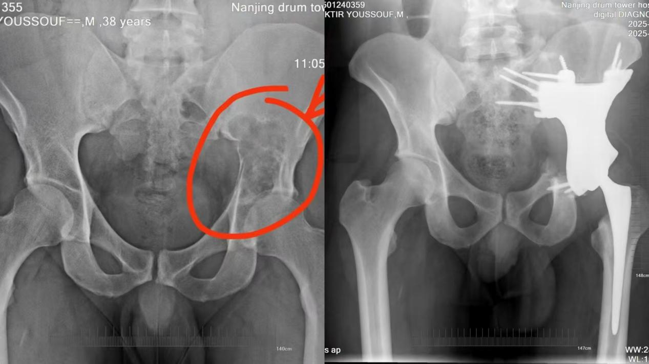 “从住院安排到各种检查再到手术排班,患者的治疗过程整体比较顺利。”南京鼓楼医院骨科副主任医师徐磊磊告诉记者,手术节点临近春节,用血较为紧张“骨盆病损切除术+骨盆重建术”术中缺血一般会达到2000-3000毫升,“我们进行了长达10天的准备,通过义务献血等一点点‘囤’够了手术备血,顺利完成了手术。”徐磊磊告诉记者,随着恢复进程,BOUKTIR YOUSSOUF术后疼痛逐渐缓解,切口愈合良好,术后病理结果确认为“软骨肉瘤,部分区域为去分化为高级别梭形细胞肉瘤”。