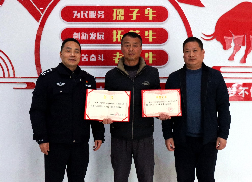 3月14日上午,在高淳区古柏街道三保村党群服务中心,村民魏小爱和魏多头都收到了社区民警魏志海送来的南京市见义勇为基金会授予他俩为市级见义勇为人员的奖励证书。