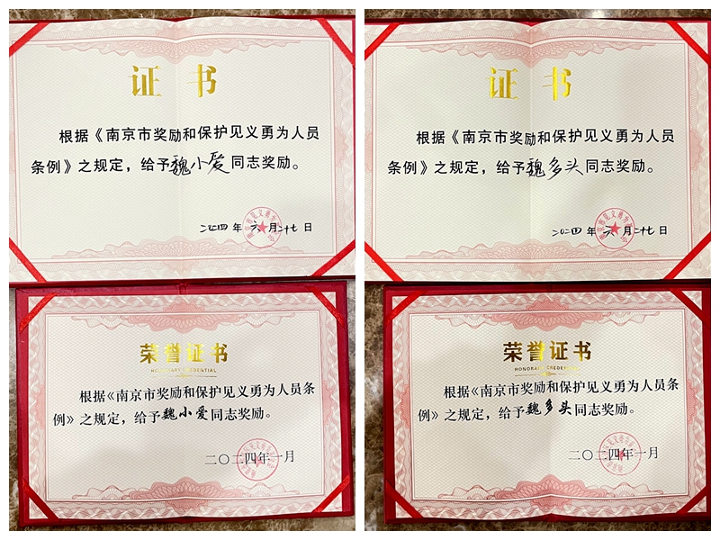 为弘扬进一步见义勇为的崇高品质,传递向上向善的良好社会风尚,近期,南京市见义勇为基金会对他们的见义勇为的事迹给予了肯定,并向其颁发奖励证书。获得市级表彰奖励的魏小爱和魏多头高兴地表示,他们只是在危难时刻伸出了援助之手,做了应该做的事。今后将积极弘扬见义勇为精神,让更多人参与到见义勇为事业中来。