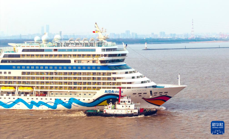 3月16日,“阿依达·星辰号”邮轮航行在上海吴淞口国际邮轮港水域(无人机照片)。 新华社发(朱嘉奕摄)