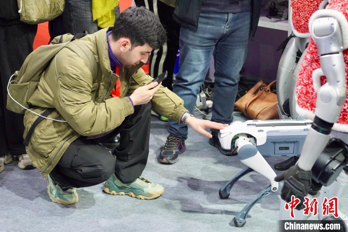 3月14日,外籍采购商诚言(İgrar)在展会上与机器狗互动。董易鑫 摄