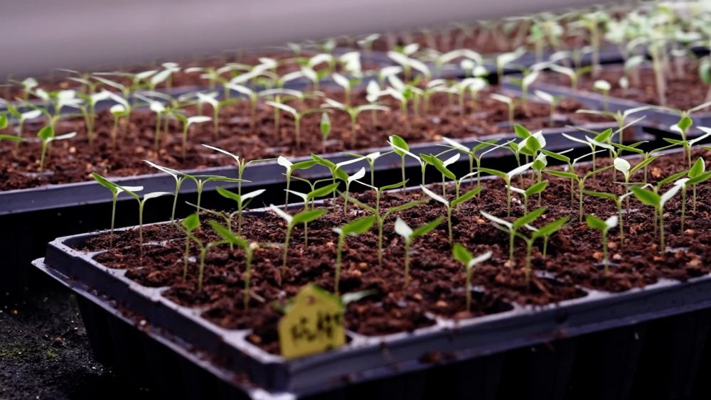 育苗工厂内,工人们用自动化播种机,依次完成装盘、上料、播种、覆土、浇水等工序。