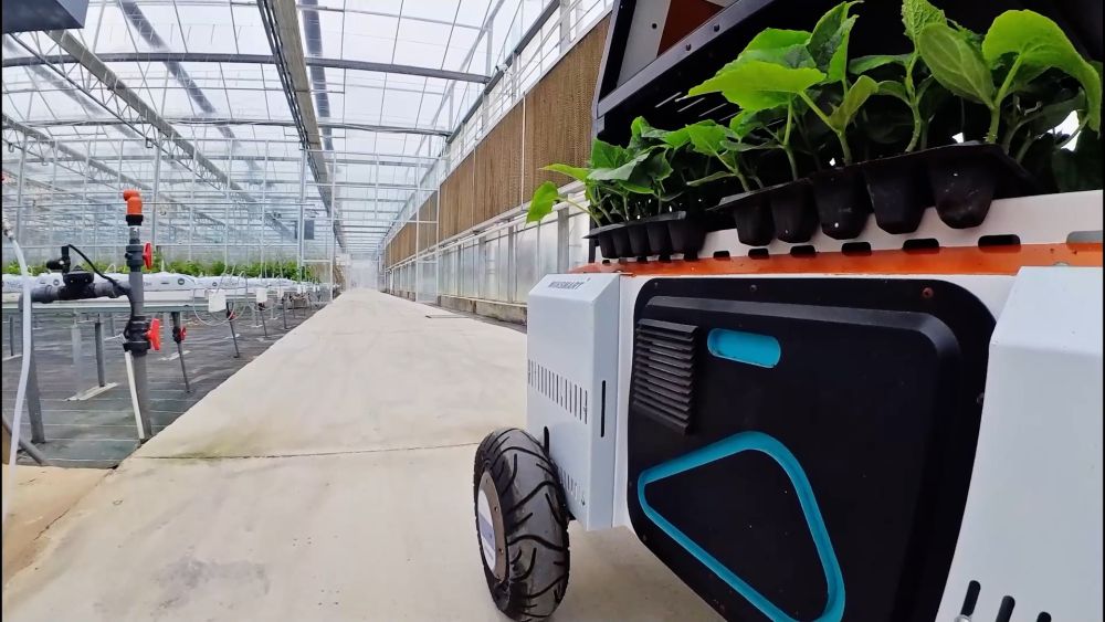在浙江省绍兴市上虞区丁宅乡农创智谷无人农场内,智能运输机器人正来回穿梭运送秧苗、肥料等,智能设备精准控制着蔬果的温湿度、水肥比例。