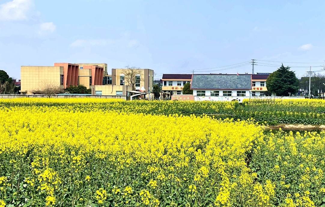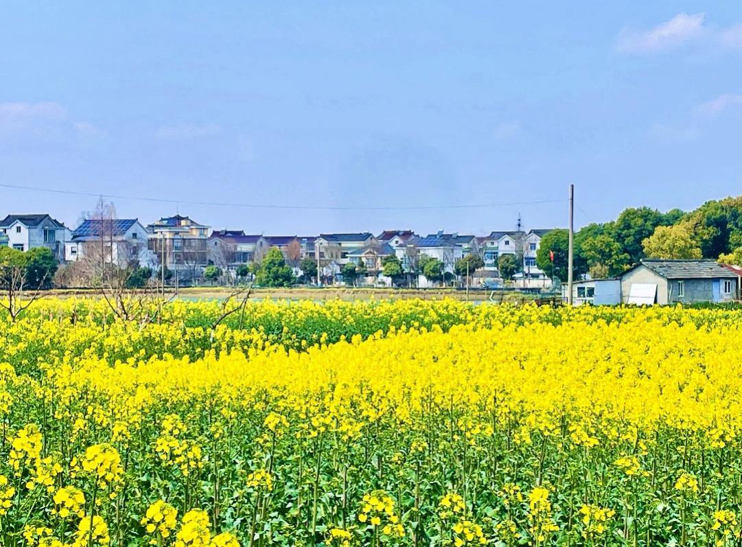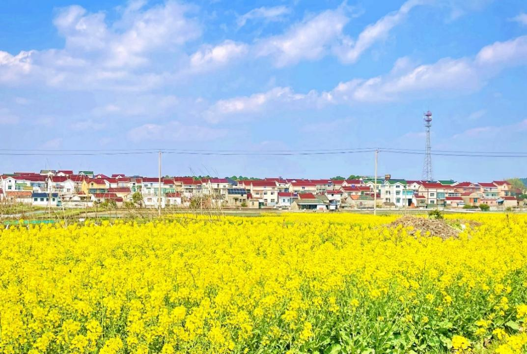 春风轻动,金花摇曳,犹如一波波金色的浪潮,带来阵阵花香,让人心旷神怡,也把村庄映照得就像一幅美丽的水彩画。