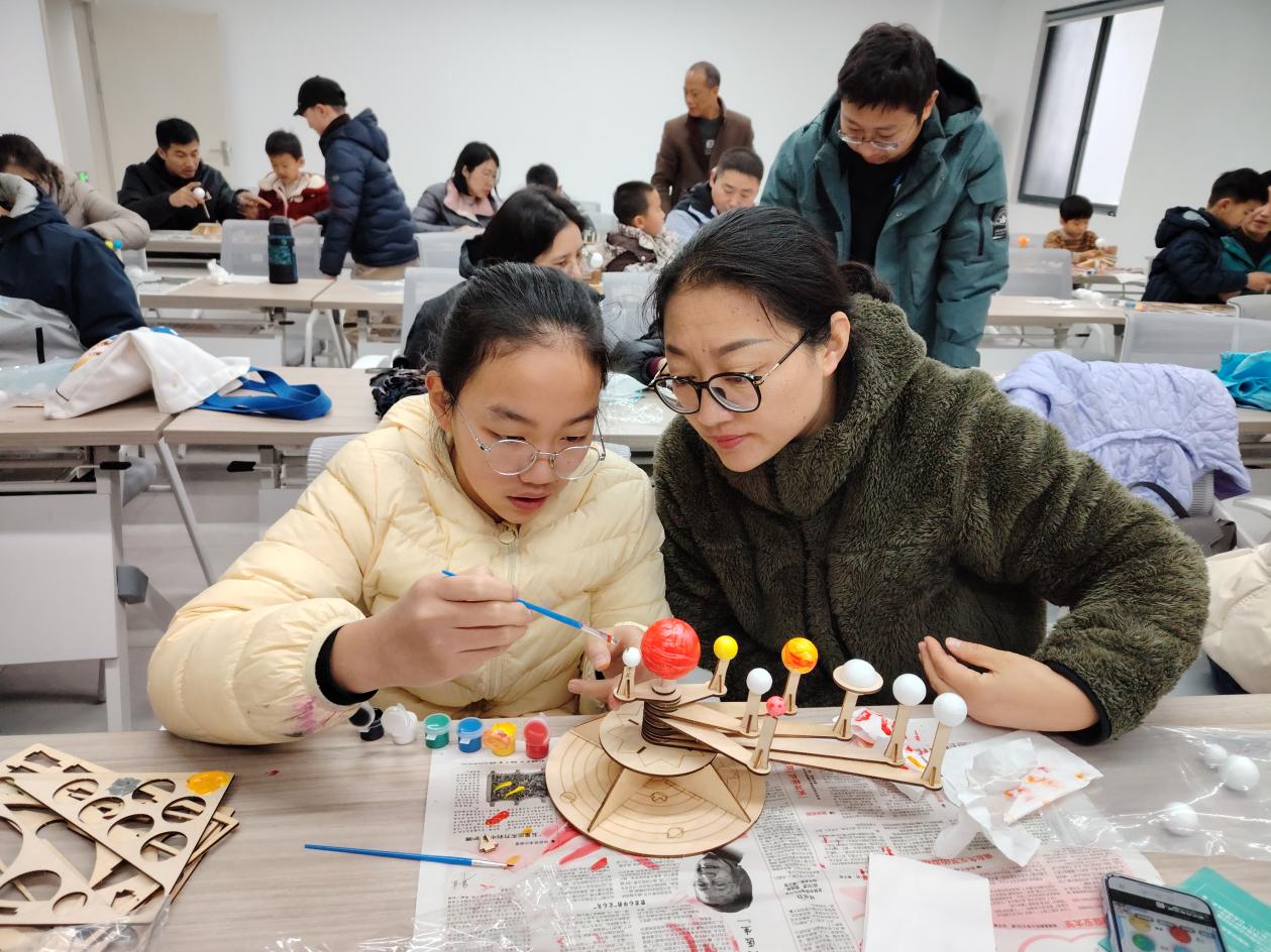 当天,核心环节“亲子九球仪制作”成为最大亮点。在专业老师的指导下,孩子与家长互相协作组装了太阳系模型,太阳、地球与八大行星在精巧的机关联动中呈现出了立体运行轨迹。制作过程中还穿插了趣味问答,复杂的天文知识通过动手实践变得生动可感。