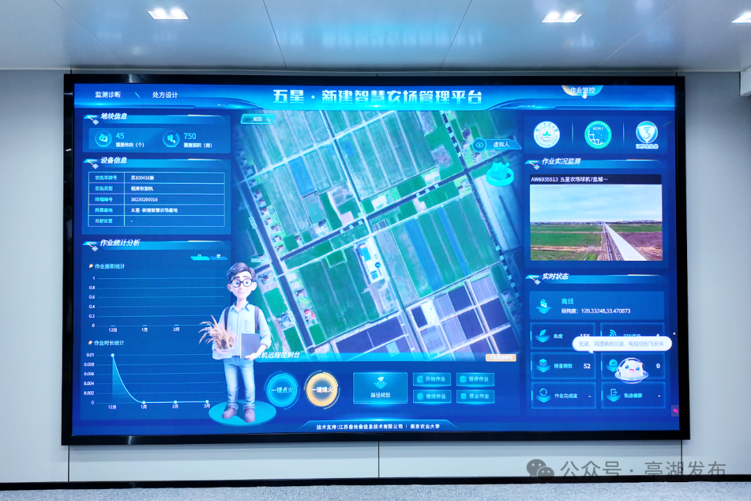 无人机、一体化物联网传感设备、高清监控设备……在五星街道五星村与盐东镇新建村共建的智慧农场,一个个颇具科技感的农业设备“驰骋”沃野。距农场不远处的五星·新建粮食生产综合服务中心,智慧农场管理平台显示屏上实时显示着气象、土壤、虫情等数据。