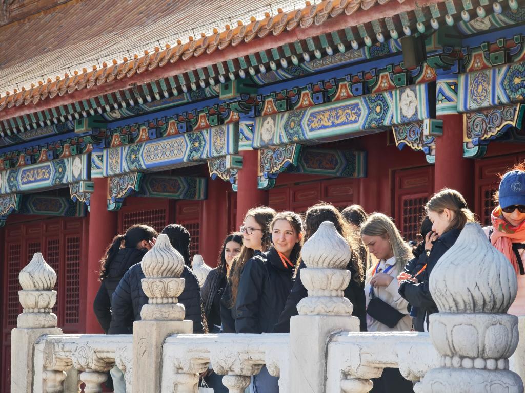 3月18日,美国艾奥瓦州高中生研学团游览北京故宫。新华社记者 马卓言 摄