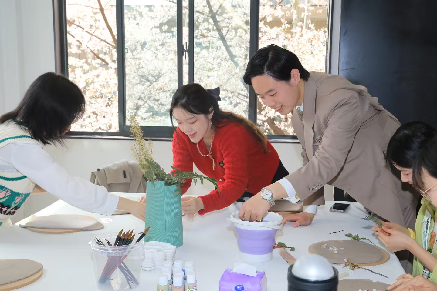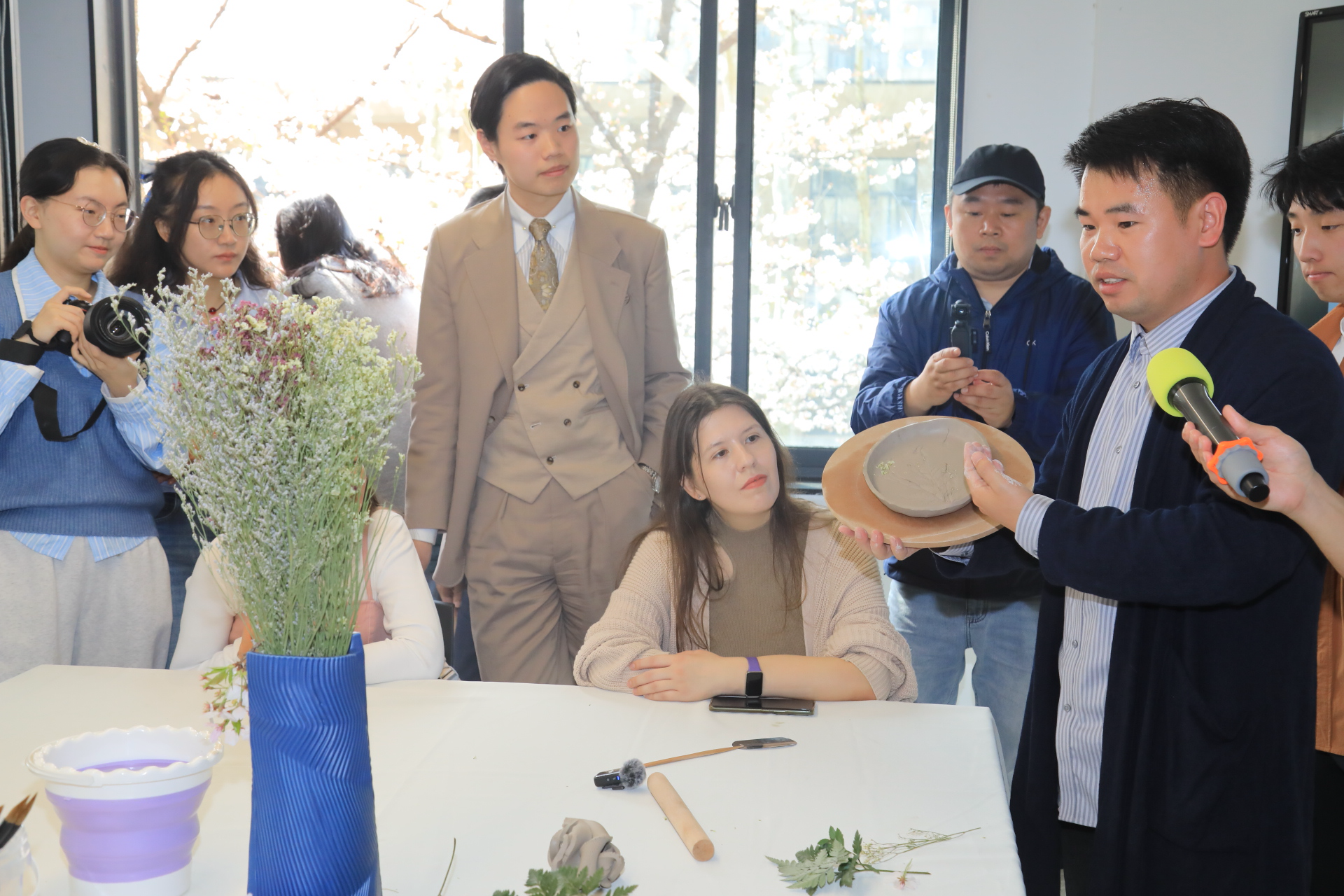 窗外,粉红的樱花怒放在枝头;窗内,斑斓的花草盛开在手中。缤纷的植物摇曳在洁白的瓷盘上,构成一幅人与自然、传统与现代和谐交融的美好画面,充满诗意与艺术气息。