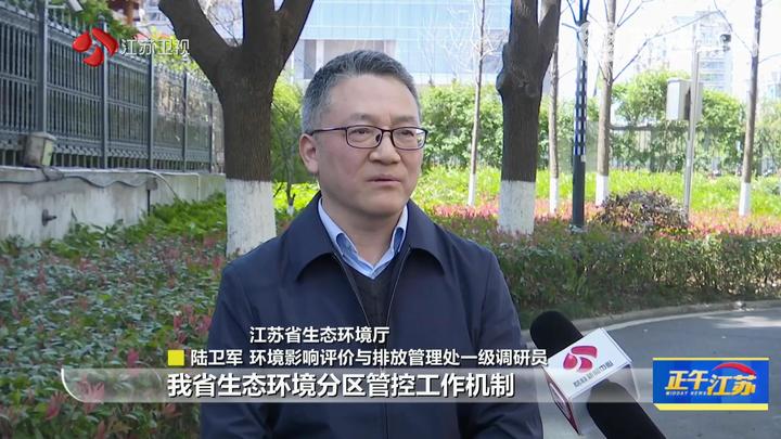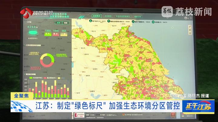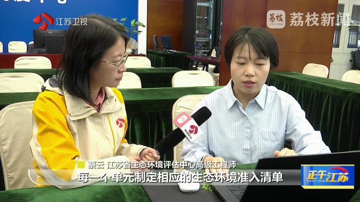 江苏台记者郑伟说:“我身旁大屏显示的是江苏省生态环境分区管控综合服务平台,可以看到江苏地图被绿色、红色、黄色的色块填满,它们分别代表优先保护、重点管控和一般管控三类管控单元。”