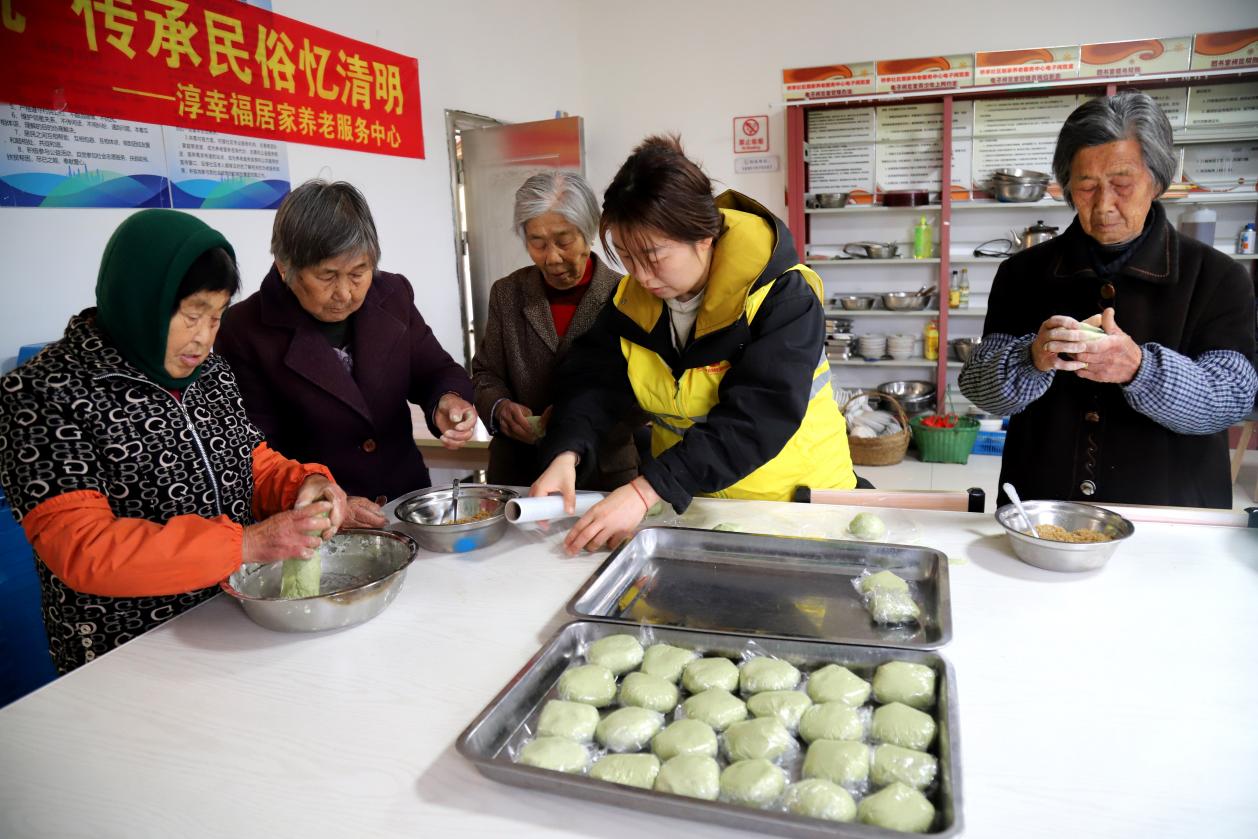 青团是当地清明节期间传统小吃。据相关工作人员介绍,为组织好这次青团制作活动,淳幸福居家养老服务中心的志愿者提前一天开始准备,到田头路边采集制作青团的鼠尾草,购置糥米粉等原料。活动现场,志愿者与老人们一起包青团,其乐融融。大家齐心协力,不一会儿,就手工制作了100多个青团。一名老人告诉记者,青团制作都是按照农家传统的制法,所用的馅料是红糖芝麻。青团蒸熟后,被及时发给每一名参与活动的老人。