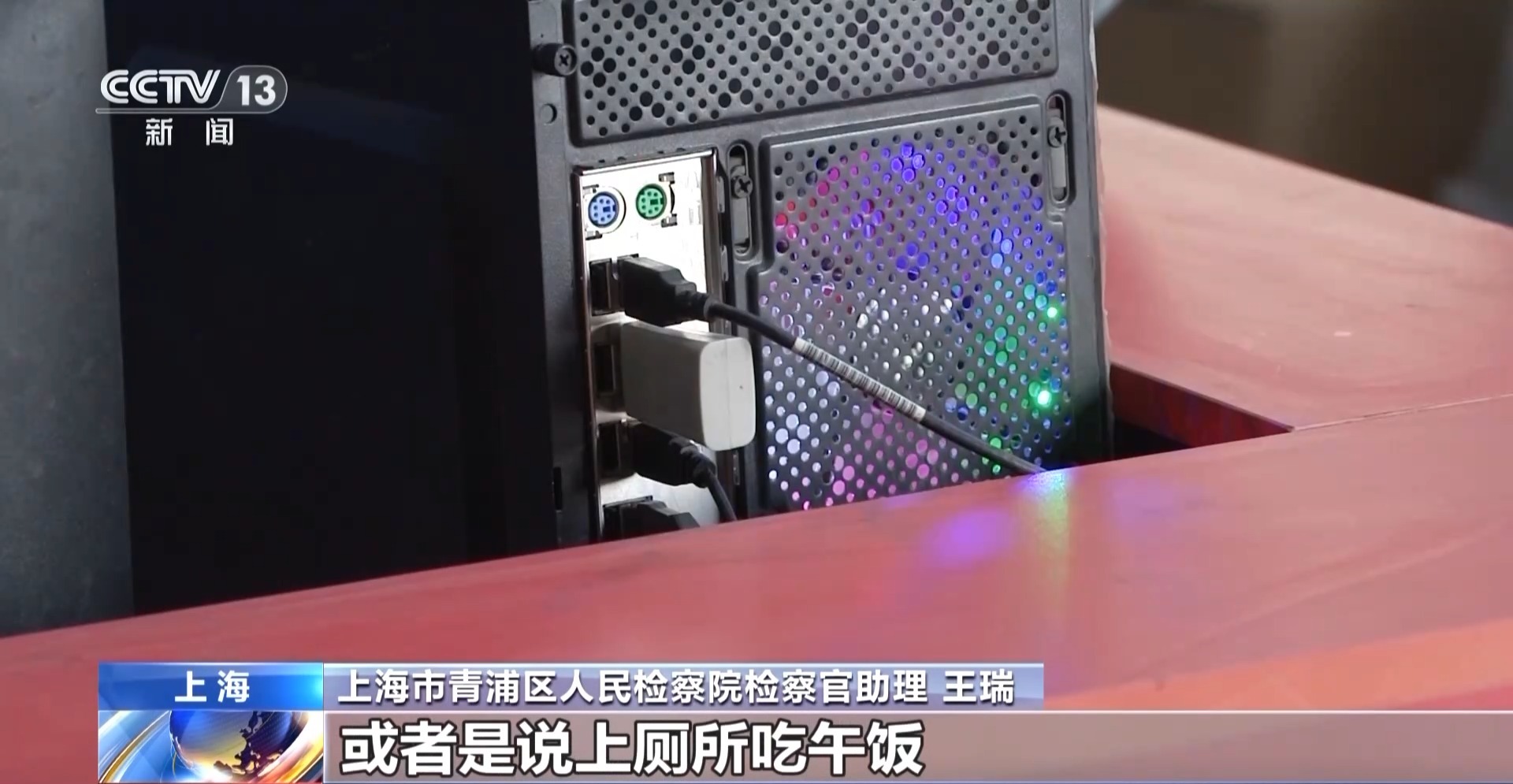 上海市青浦区人民检察院检察官助理 王瑞:他趁工作人员不在岗,或者是说上厕所吃午饭的工作间隙,去操作电脑,短短几分钟,插一个U盘,安装到一个非常隐蔽的地方,然后马上拔U盘走人。