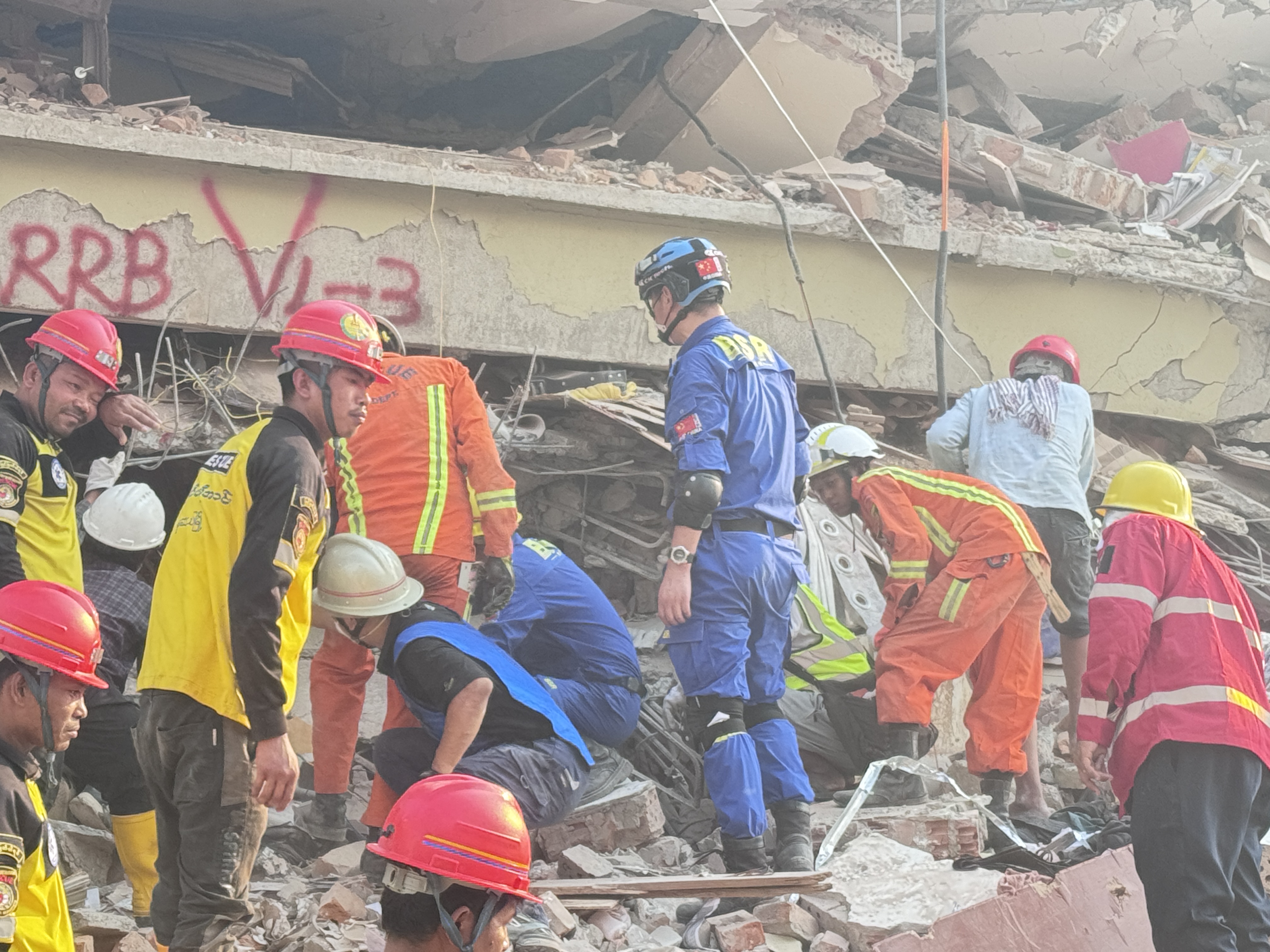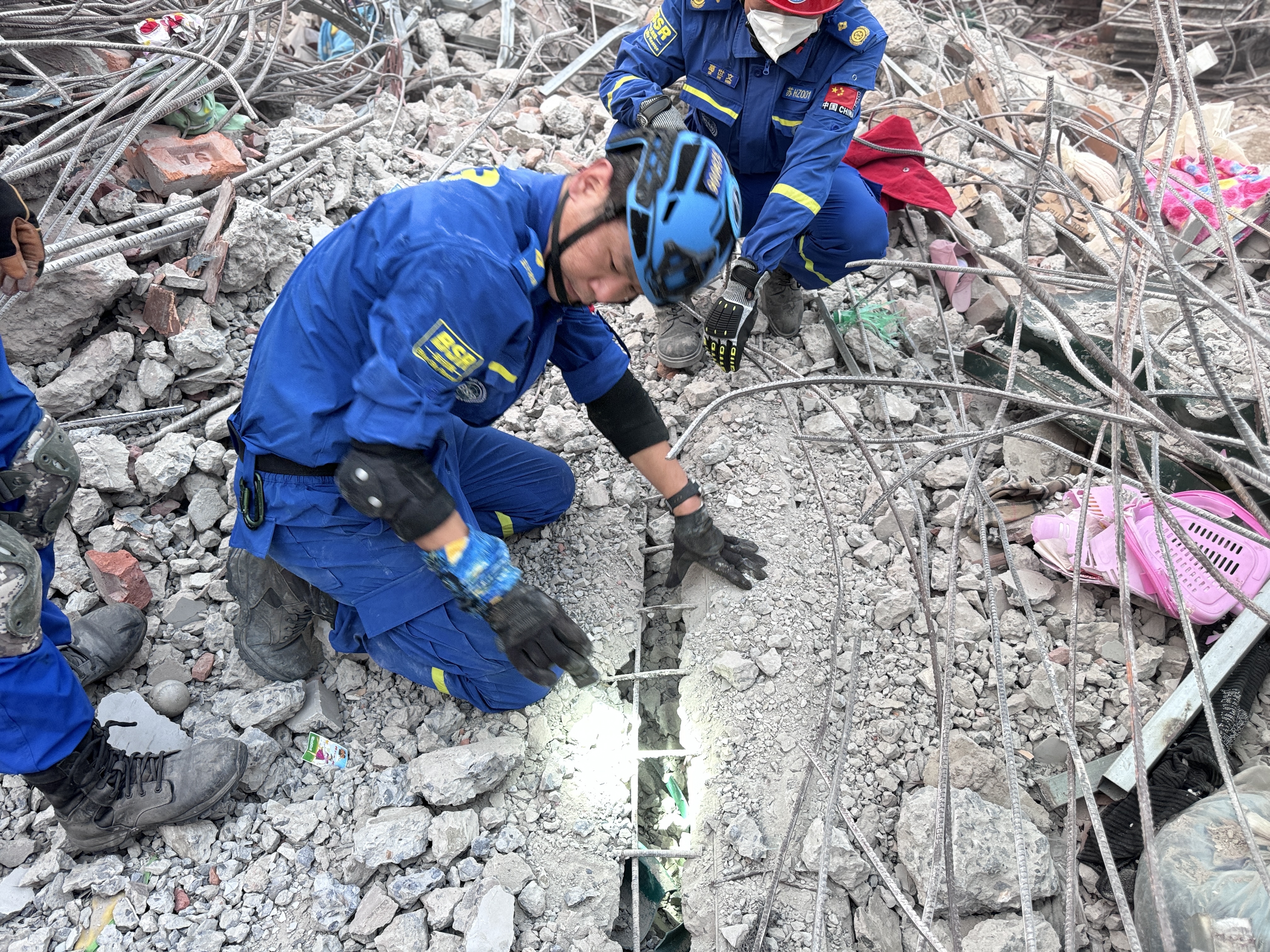 江苏蓝天是最早到达曼德勒的国际救援队伍之一。童波是江苏蓝天本次行动的总领队,他说,他们最先前往的是Sky Villa公寓楼所在区域。现场建筑损毁严重,余震不断,队员们在携带厚重装备开展救援的同时,还不得不时刻做好次生灾害的防控准备。