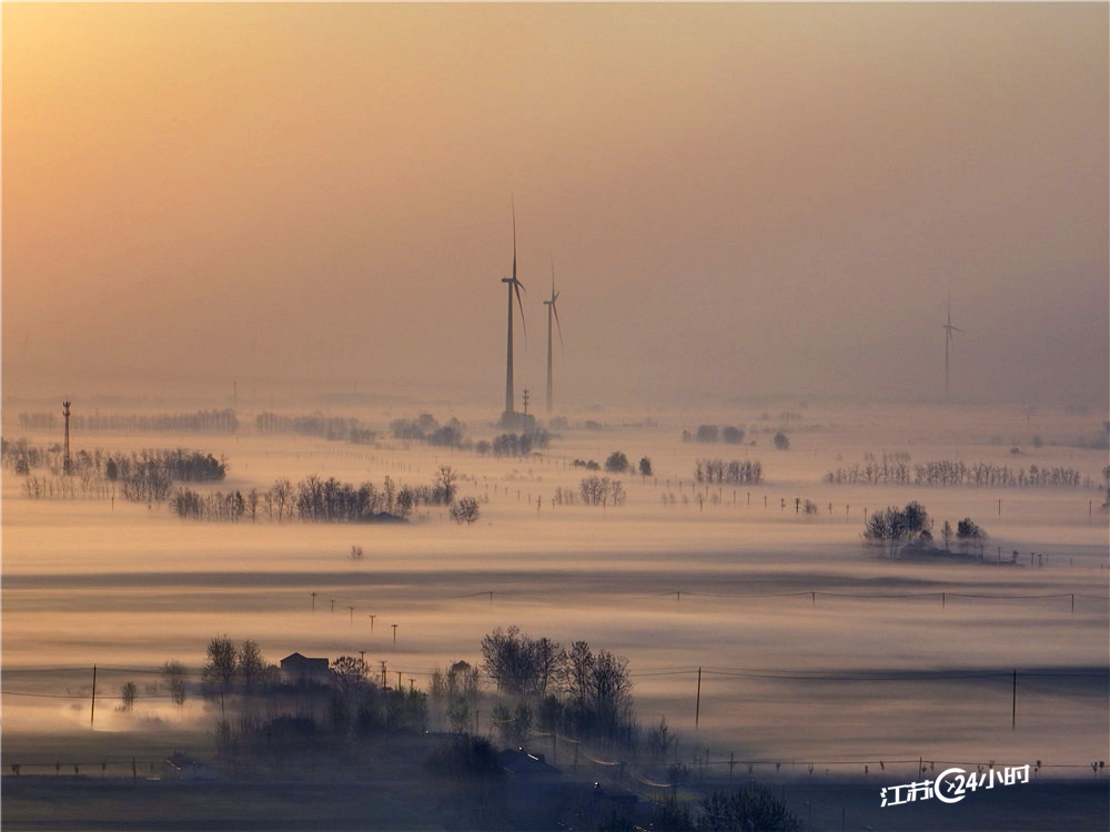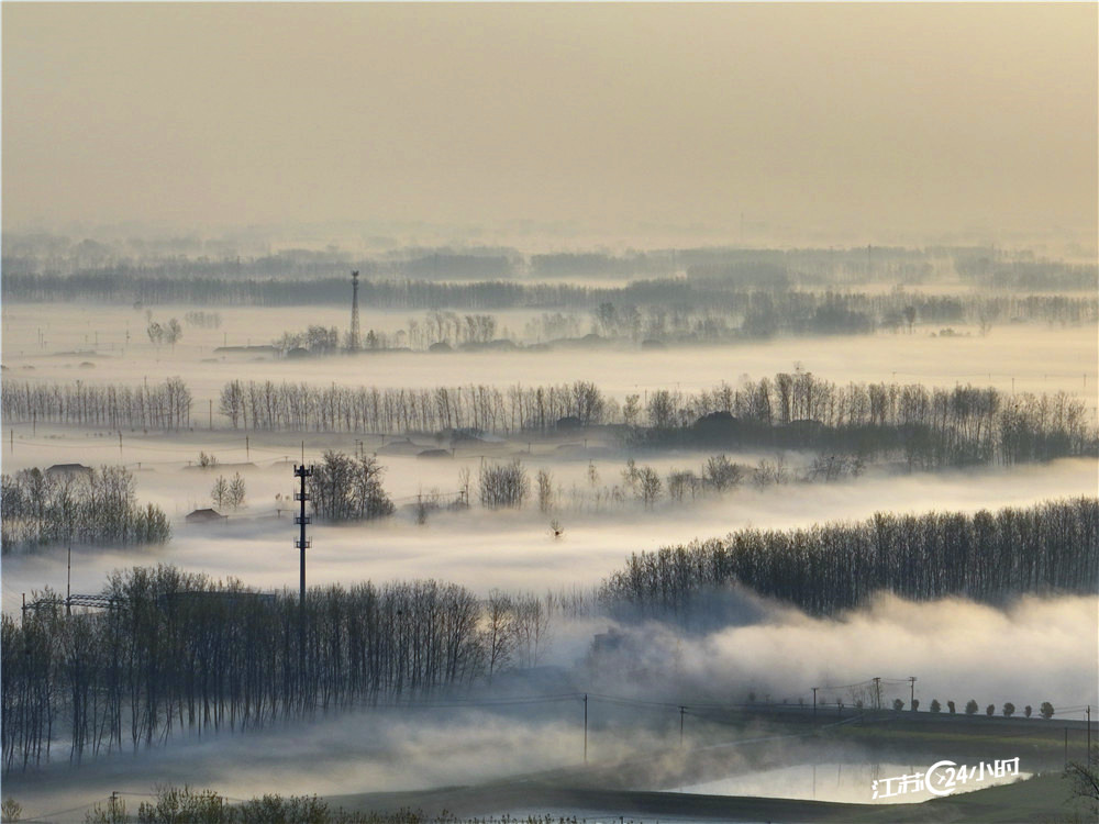 (特约摄影 张德春 06:10摄 10:10上线)4月6日,淮安市洪泽区三河镇上空现平流雾,村庄、道路、房屋被笼罩,似水墨画。